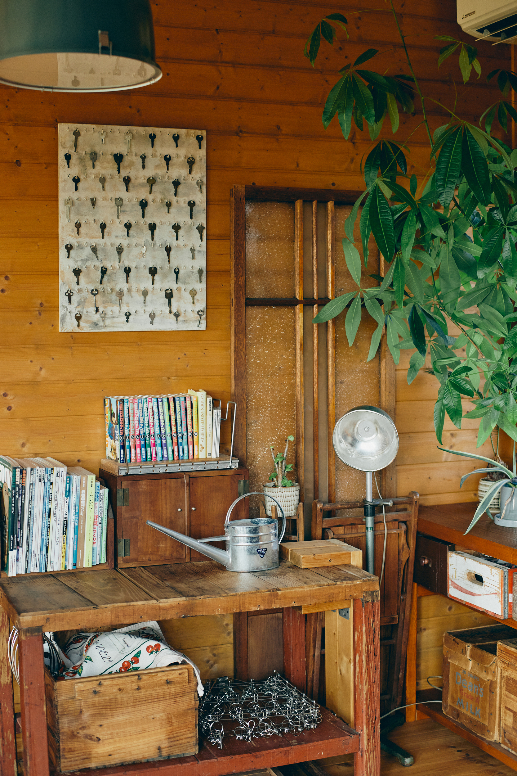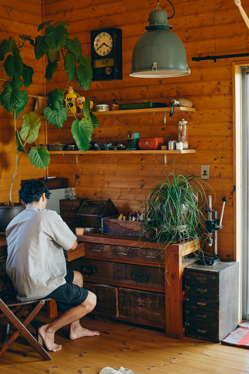 2階のロフトスペースには、趣味のレザークラフトを行う作業スペースをDIY。「引き出しが好きでつい買ってしまうのですが、デスクはそれらの組み合わせを前提にサイズを決めました」。お気に入りのアイテムは、ダイニングでも使っているアメリカ製のヴィンテージチェア。「ギミックがおもしろいんです。あと、古着屋で買い集めていた古い鍵を飾ったらおしゃれかなと思い、板にフックを付けて飾りにしました」。