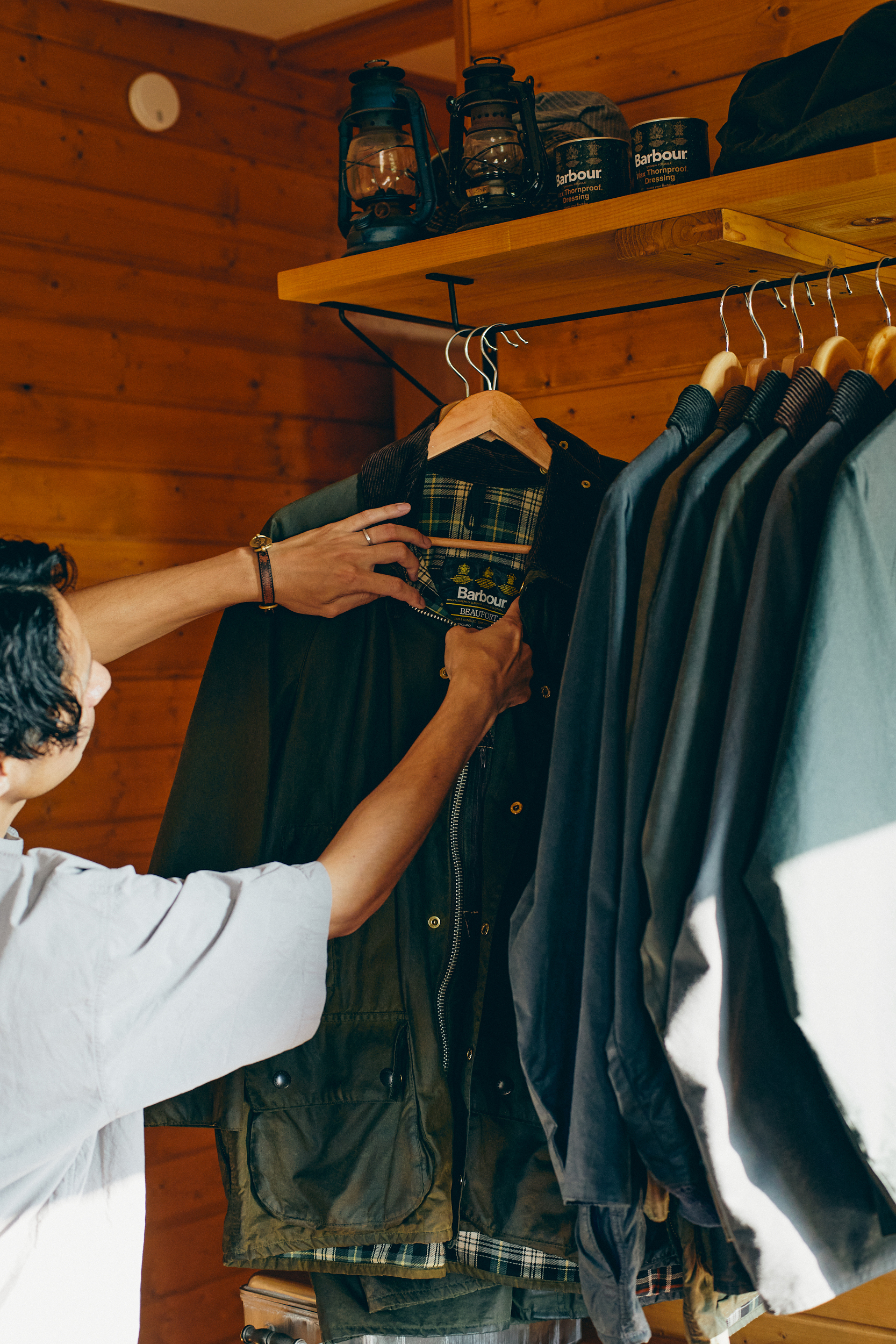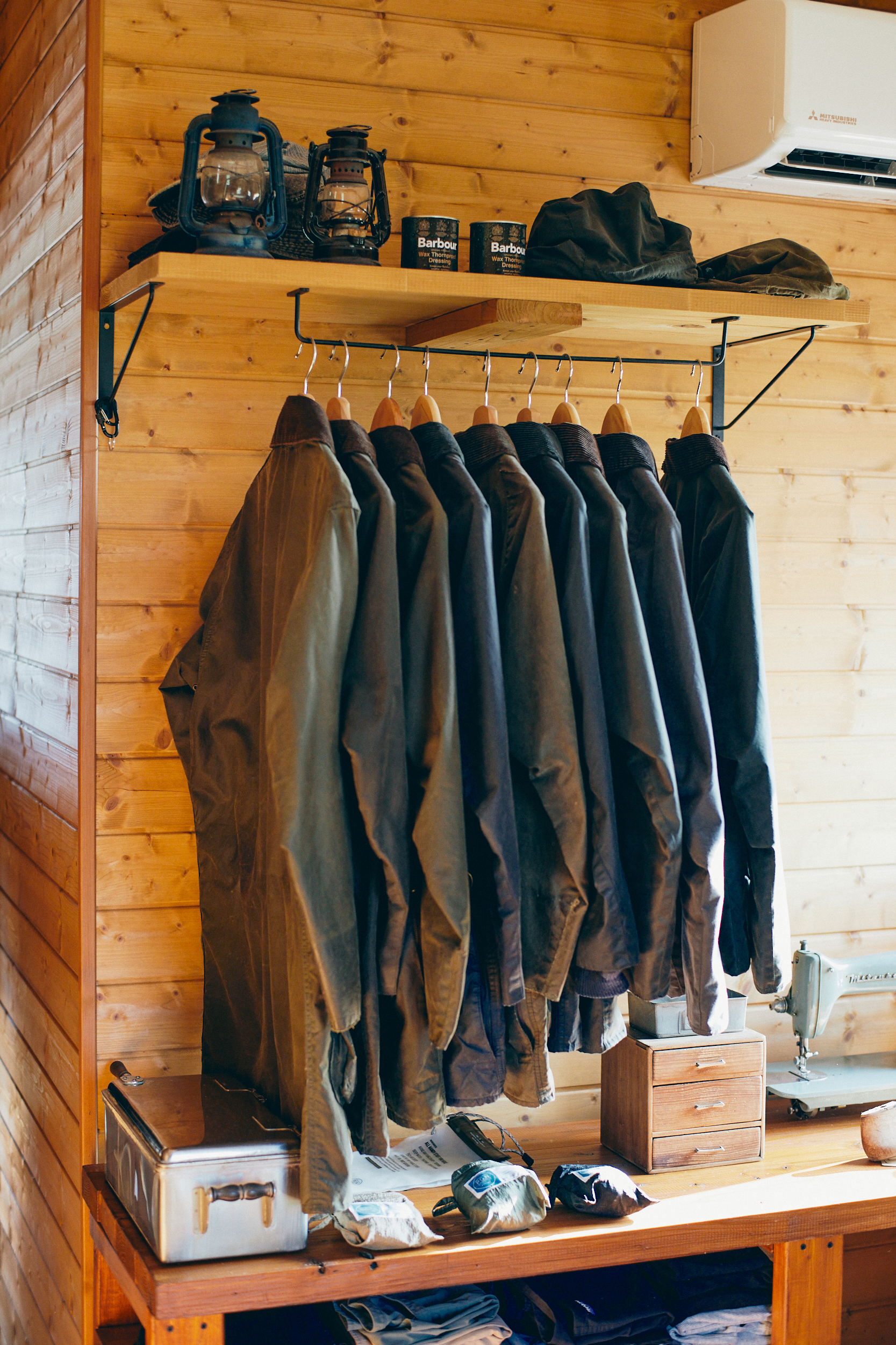 古い家具と同様に、古着も好きという夫婦。とくに隼さんはBarbourをコレクションしているそう。「ビューフォートというモデルがお気に入りで、これは生まれ年に作られたバースデーバブアーです。自室にあるDIYの棚には、コレクションを飾りました」。