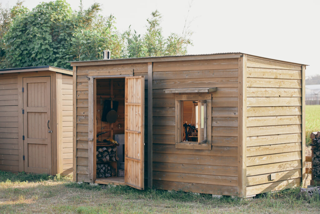 庭の横には薪ストーブを設置した手作りの小屋まで! 寒い時期に鍋をしたりピザを焼いて過ごすとか。「家に薪ストーブを設置していませんが、ここで楽しめています。DIYの作業小屋としても使っていますよ」。