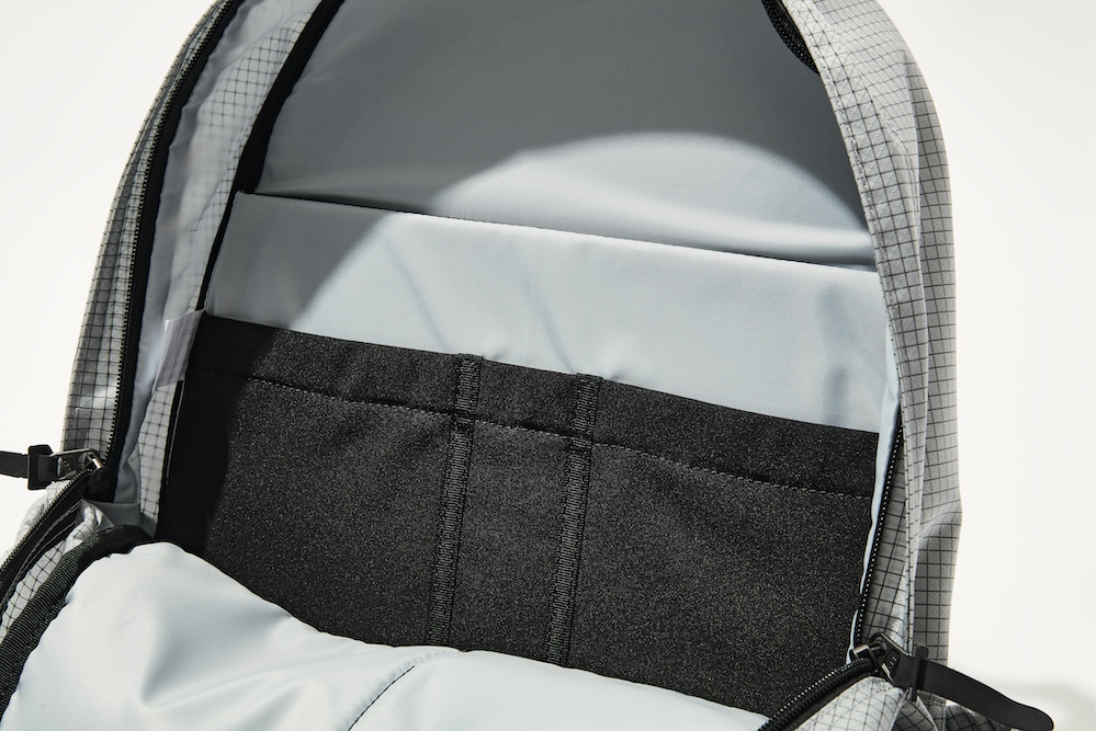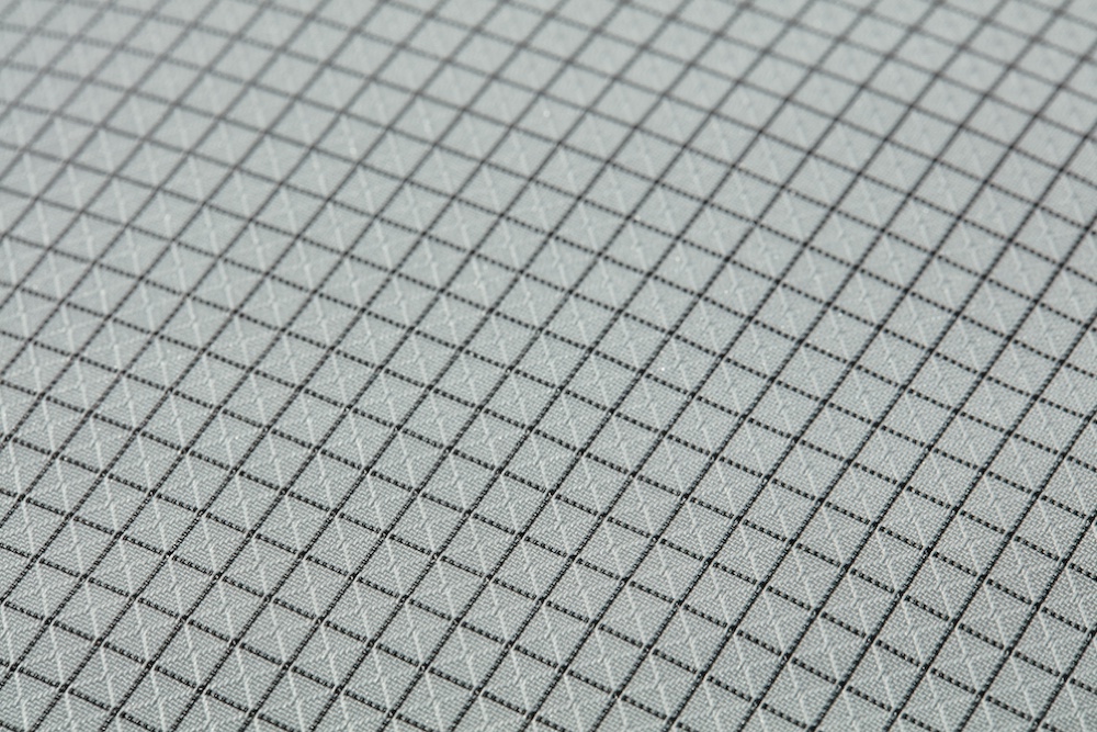 高い強度と軽さを両立させた高機能素材「Robicリップストップナイロン」。そして、軽量ながら有機繊維として最高レベルの強度と弾性率を持つ「UHMWP(超高分子量ポリエチレン繊維)」。この2つの素材を織り込むことで、グリッドがクロスした特徴的な表情となっている。