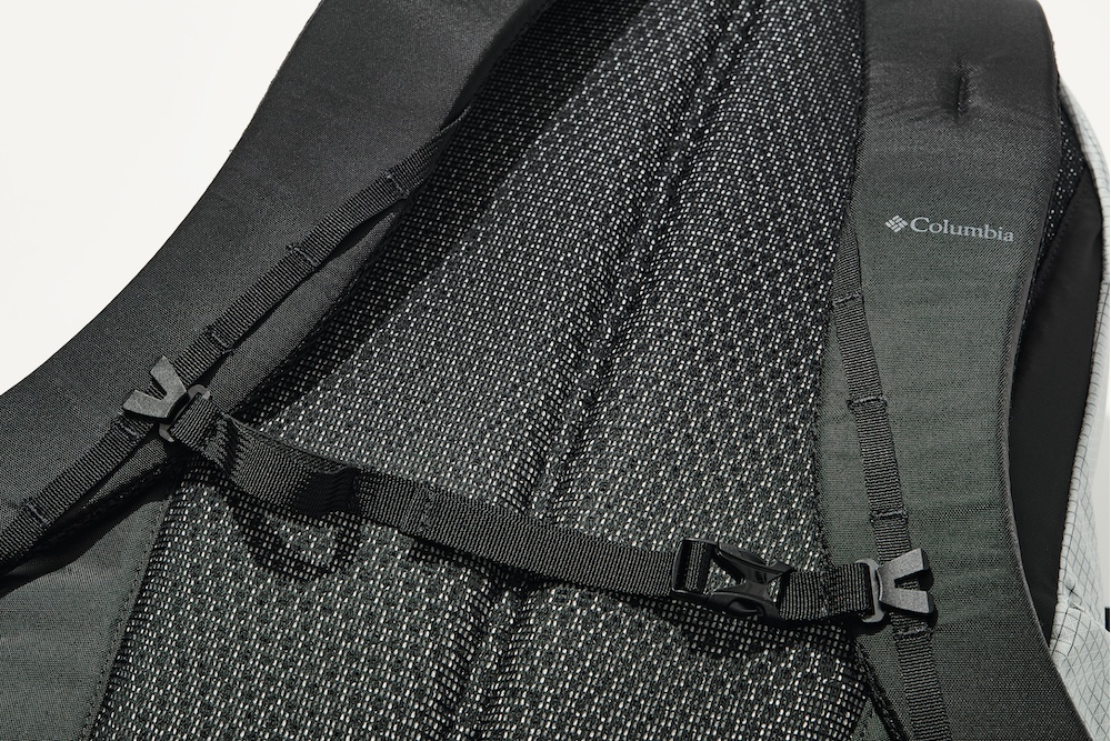 強度と耐久性に優れた「ROBIC」ナイロンの210デニールと、超高分子量ポリエチレン「EXTREEMA」を格子状に織り込んだ素材は、引き裂き強度と耐久性に優れ、コロンビア独自の撥水機能であるオムニシールドを採用し、雨にも対応。パッド入りの背面には通気性と快適性に優れた3Dメッシュを全面に使用。