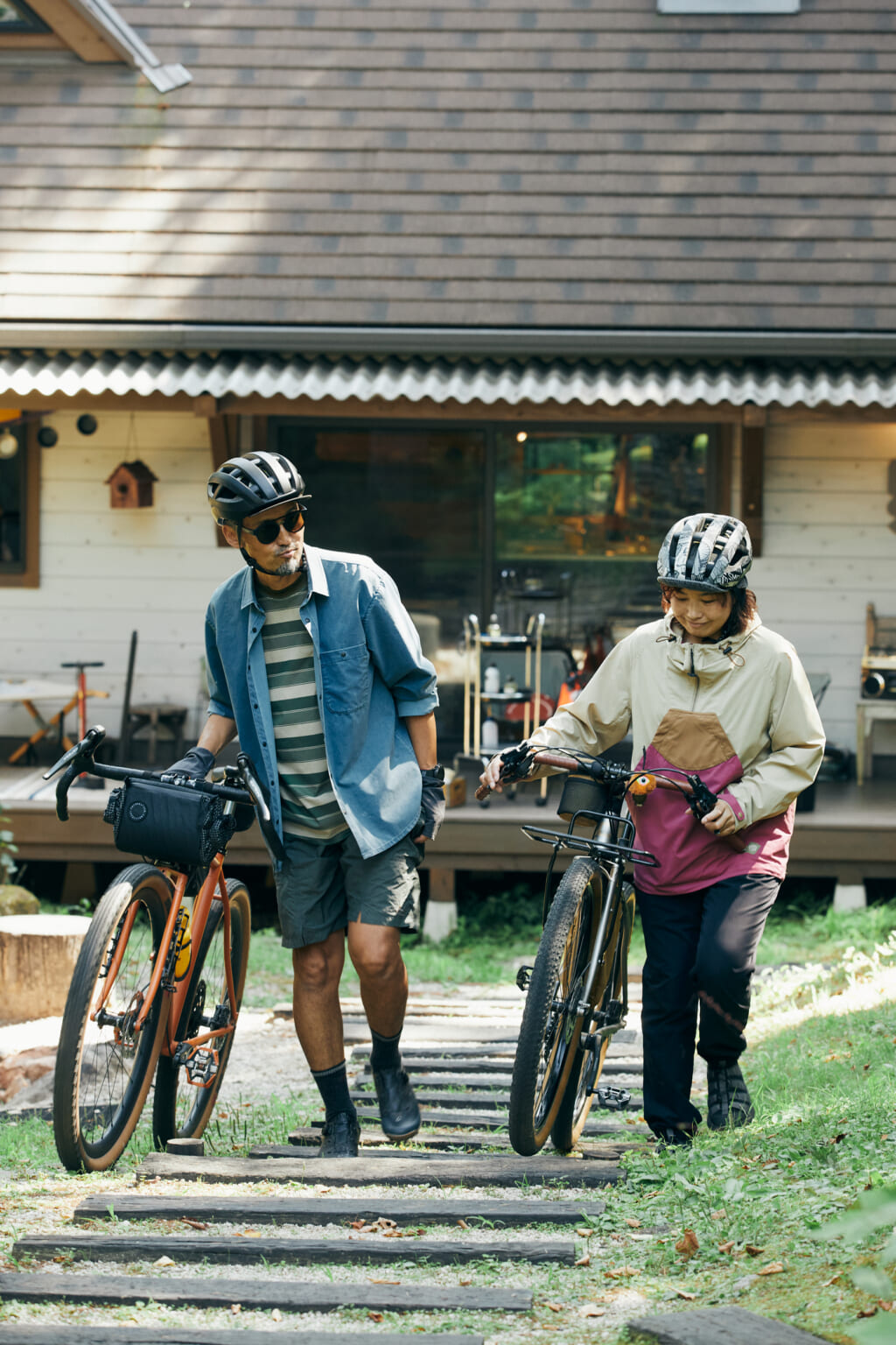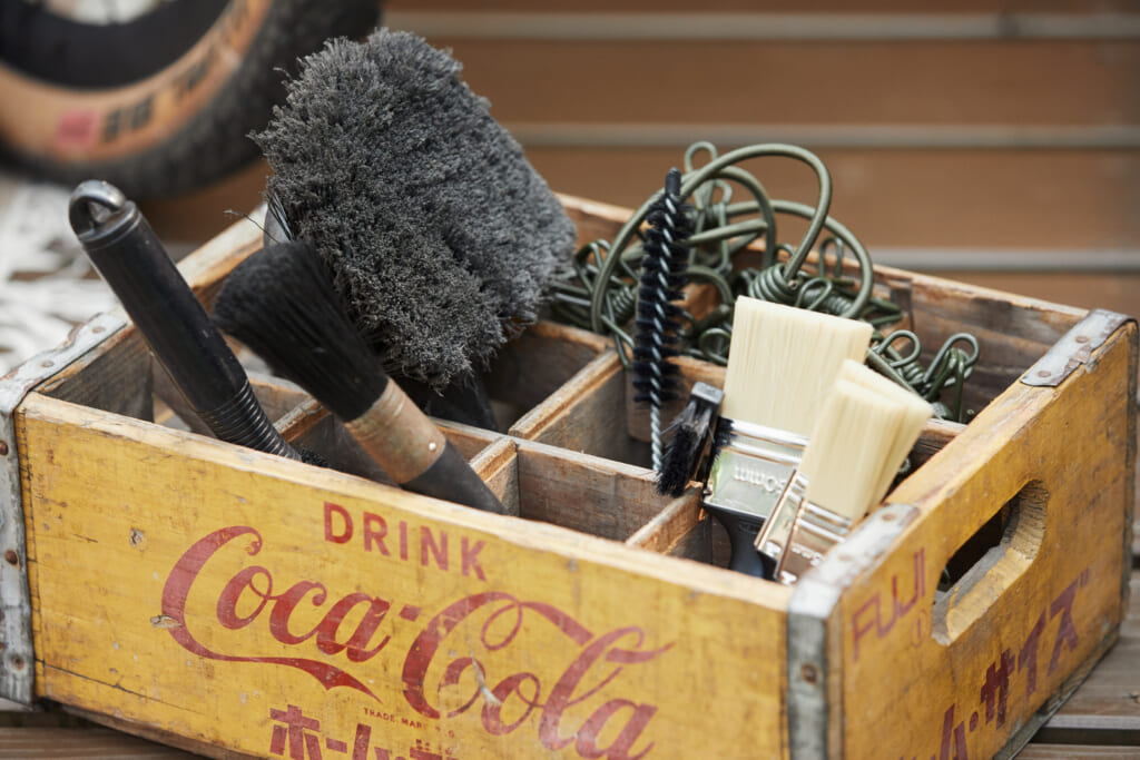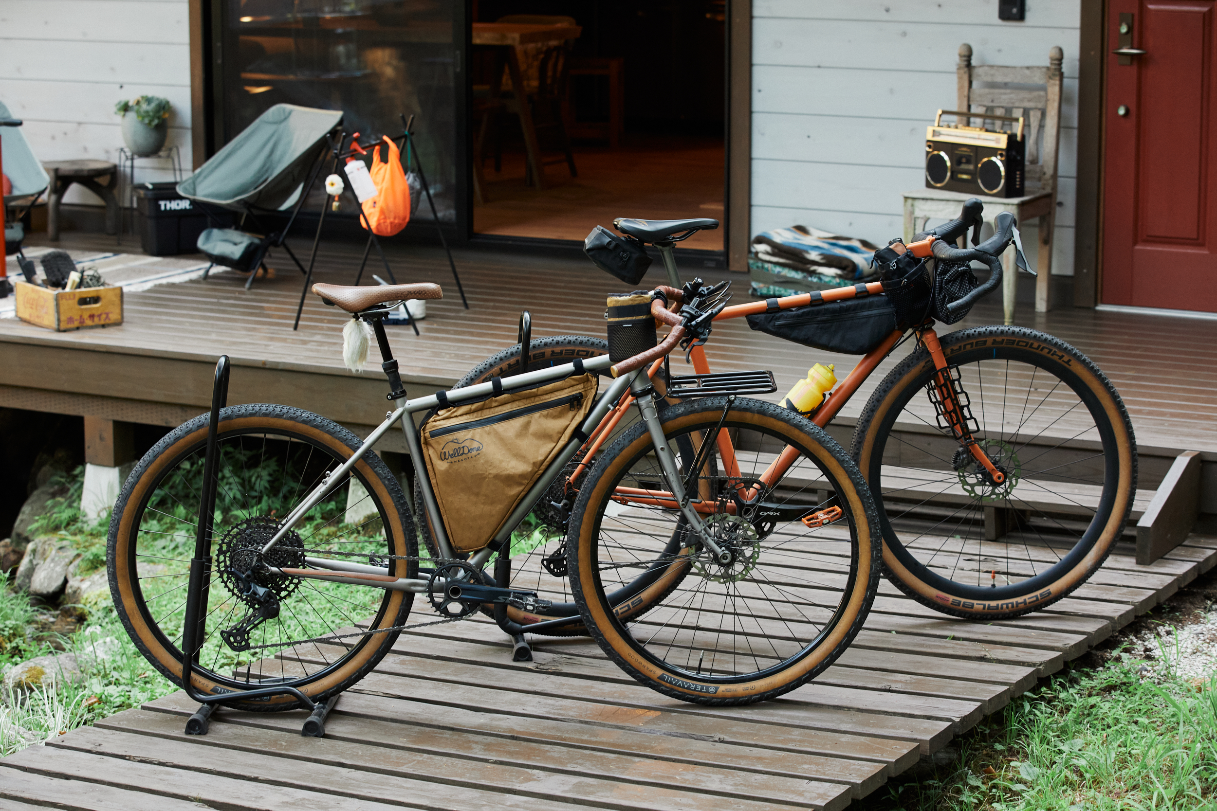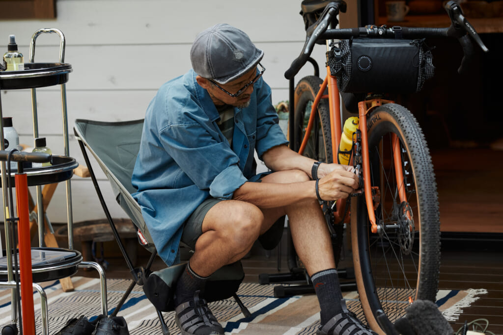 ウッドデッキでバイクのメンテナンスをする際は、小さなパーツの紛失防止として、ラグやマットを用意。武村さん夫婦の愛車は、ショップオリジナルのシーバイクランプのグラベルバイク。アクティビティだけでなく、毎日ライドを楽しめるよう個人に合わせた完全オーダーメイド。