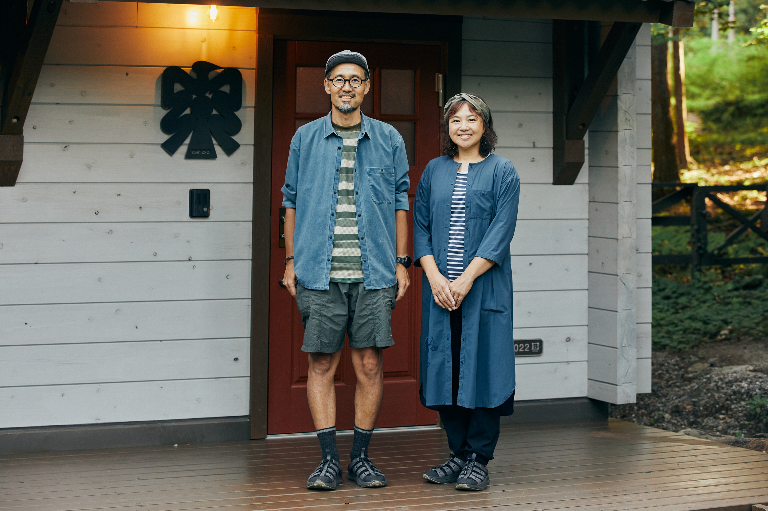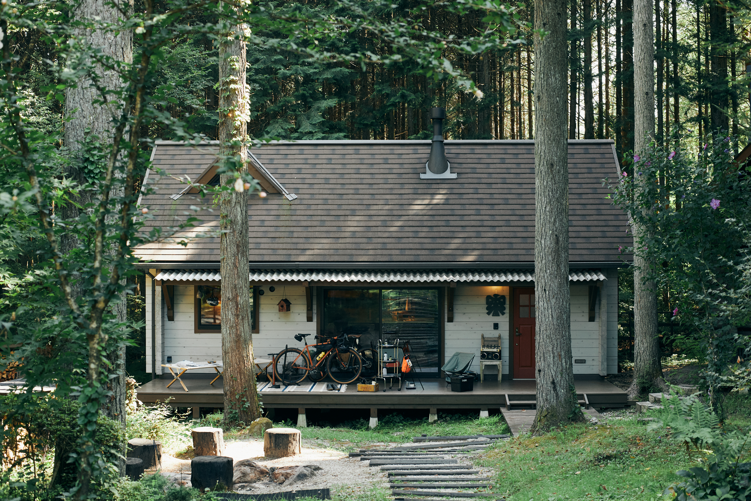 ログハウスをBESS流の平屋に仕上げた、栖(すみか)口グ。壁のない室内やリビングとつながるウッドデッキなど、自由な作りの木の家を、外遊びの達人夫婦はどう暮らすのか? 体感してもらいました。