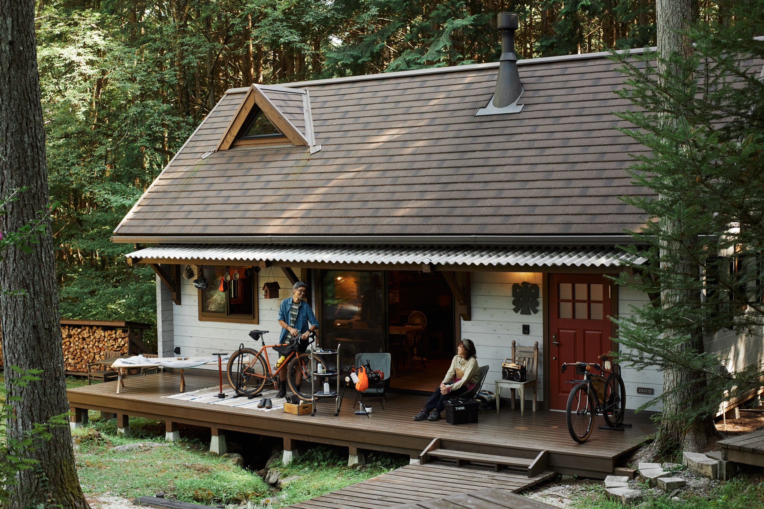 「昭和レトロな雰囲気もアウトドアも、共通の趣味が多いんです。だからすべてに手が届くようなコンパクトな空間で、好きなものが常に身近にある生活はいいですね」。そう話す由紀子さんは、日々活発に動き続ける武村さんを支える存在。家の中での作業中も、ウッドデッキなどで自転車を整備する姿が見えるサイズ感もお気に入りだ。