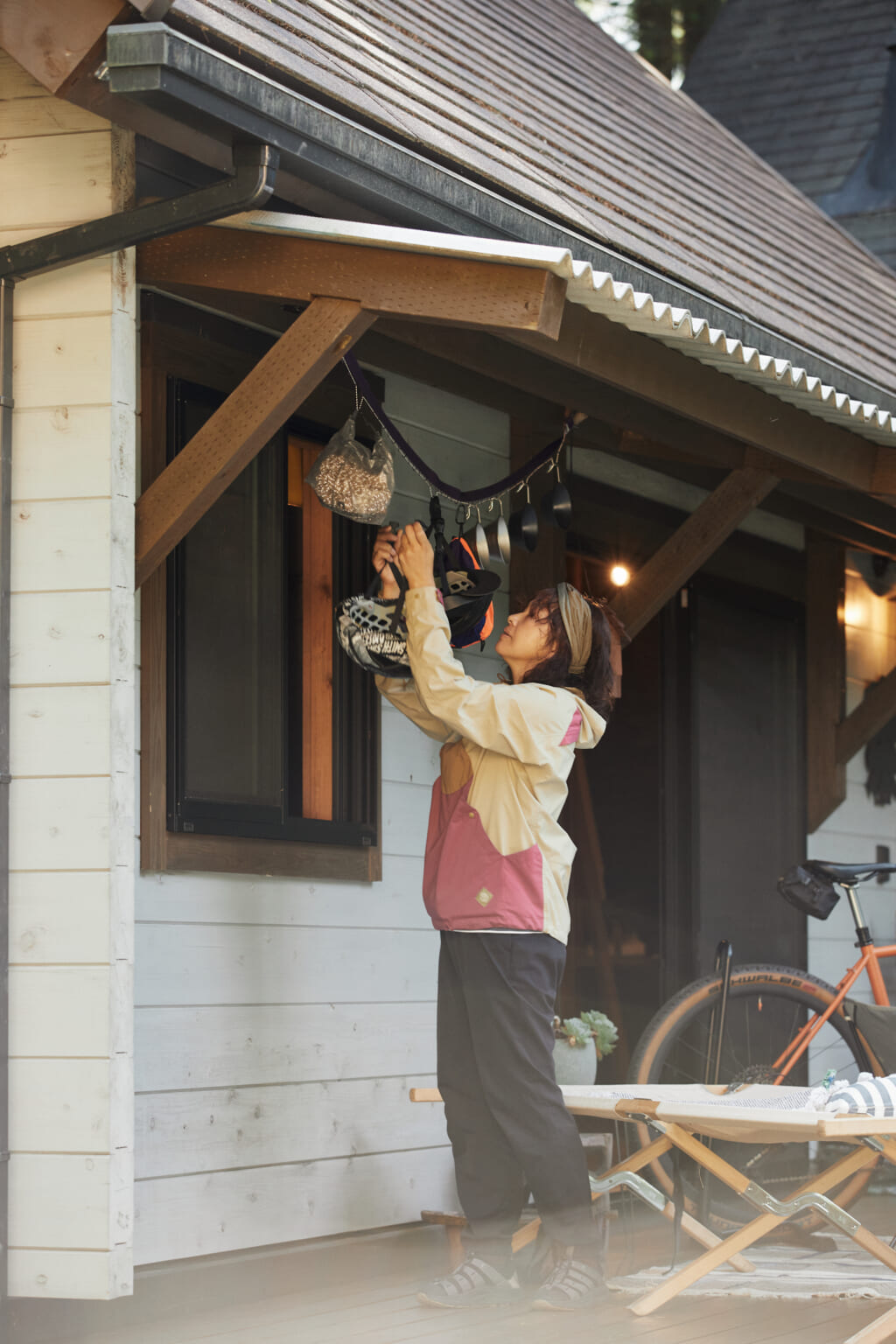 今回のM40サイズには2か所にロフトがあり、左右をつなぐ空中廊下を備える。ギアの保管は効率の良さがポイント。「デッドスペースになりがちな天井や壁が使いやすい。お気に入りの道具をいつも見られるのもいい(笑)」。また、バイク用のヘルメットやシューズなど使用頻度の高いものは、乾燥を兼ねて軒下に吊るして収納。