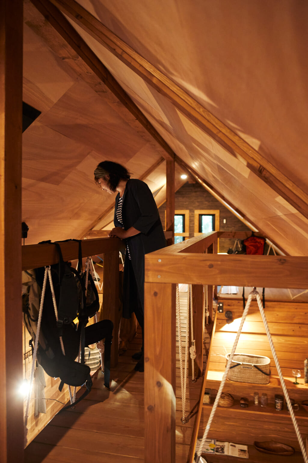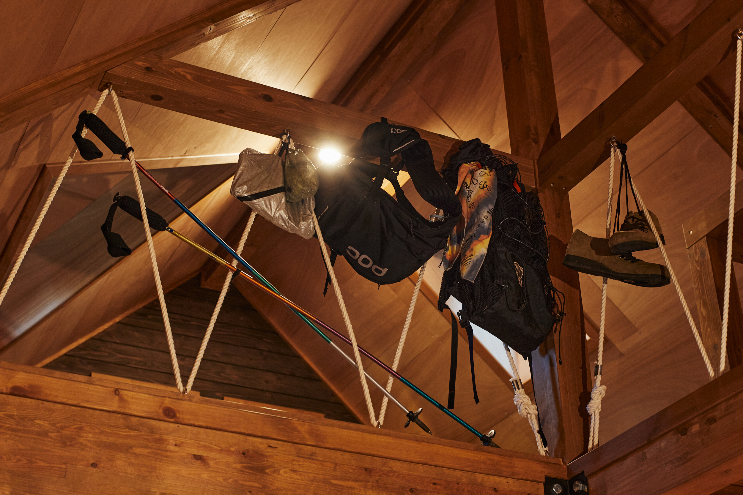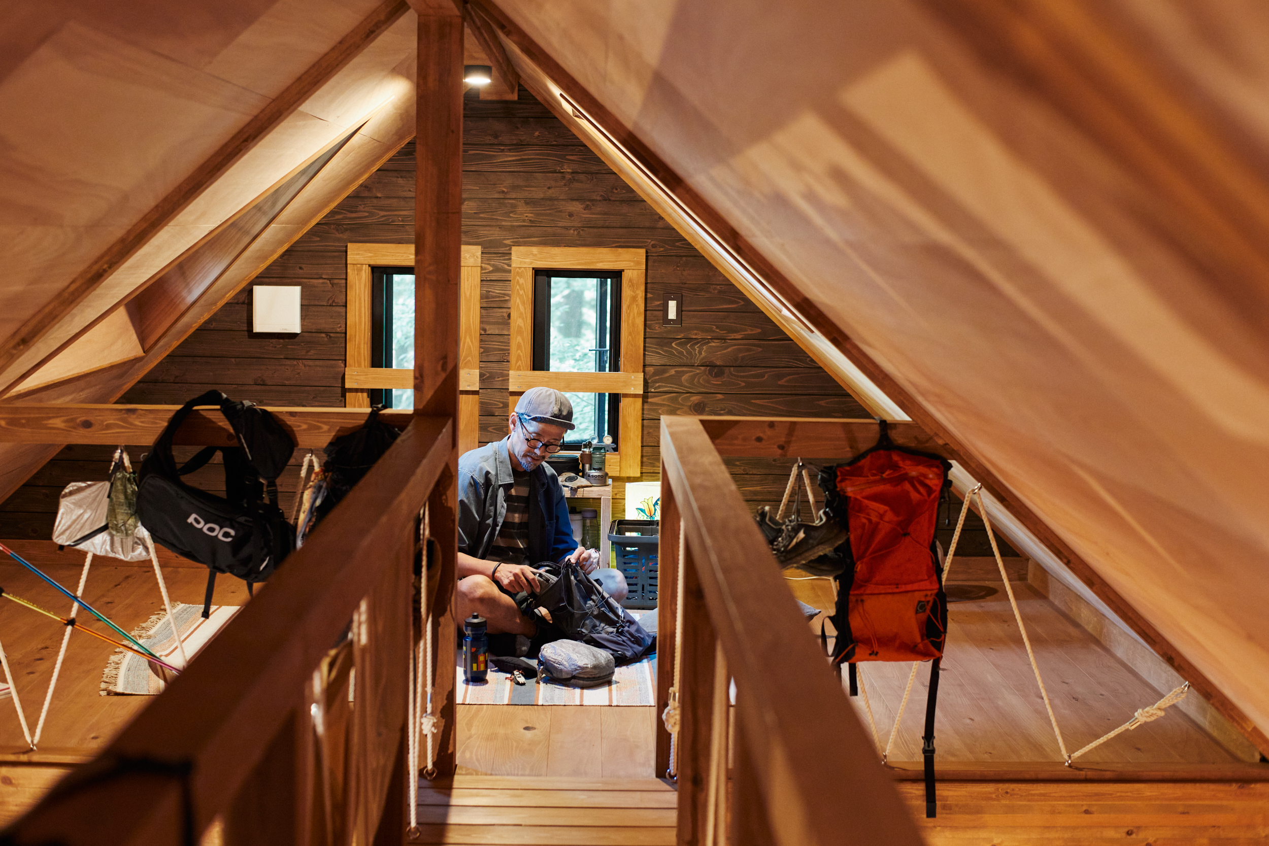 小屋裏と呼ばれるロフト空間。「広さがあるから、ギア収納やストレッチする場所、寝るところにもなるし、アイデアが膨らみます」。バイクから登山、バックカントリースキーまで年中、山で遊ぶ武村さん。数多くあるギアのうち、季節外のものは壁や天井の空間を活用して収納するそう。「見せる収納は取り出しやすく、忘れ物防止にもつながります」。