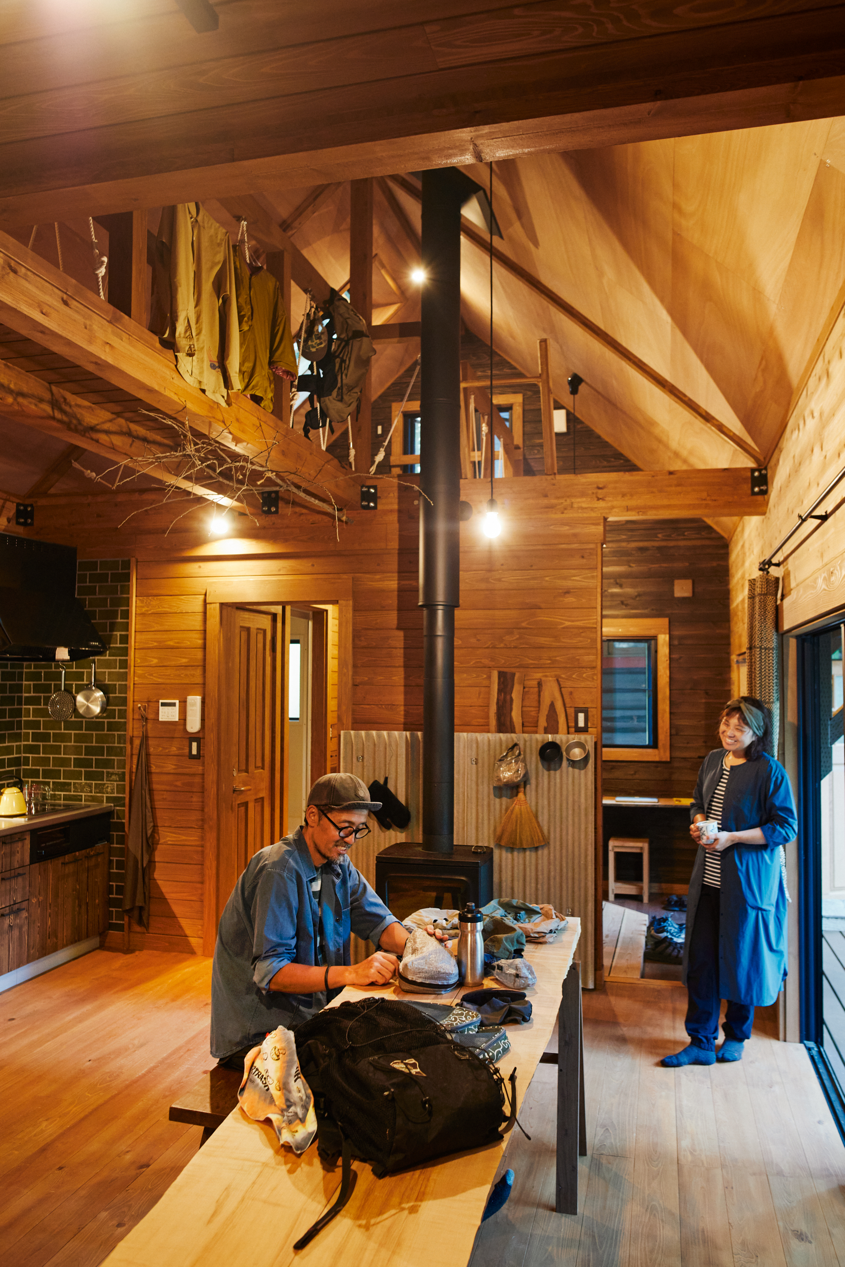 壁のないLDKと隠れ家的なロフトだけのシンプルな木の家、栖(すみか)ログでの暮らしを体験してくれたのは、長野・伊那で自転車屋CLAMPを営む武村さん夫婦。二人はアウトドアのほか、昭和レトロ好きという共通点も。「いずれは平屋に住みたくて。夫婦と飼い猫3匹が住むには十分な広さです」。