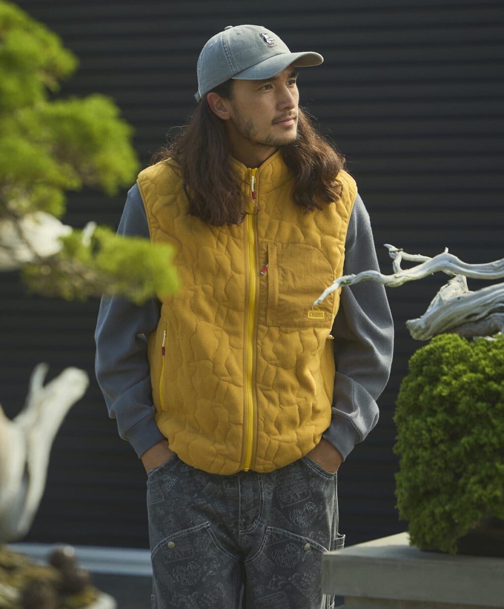 人気の「ブービーステッチ」シリーズは、もちろん半纏以外にも、さまざまなアイテムを展開している。差し色的に取り入れたフリースベストも、個性的なステッチのおかげで、スタイリングの主役として活躍する。
