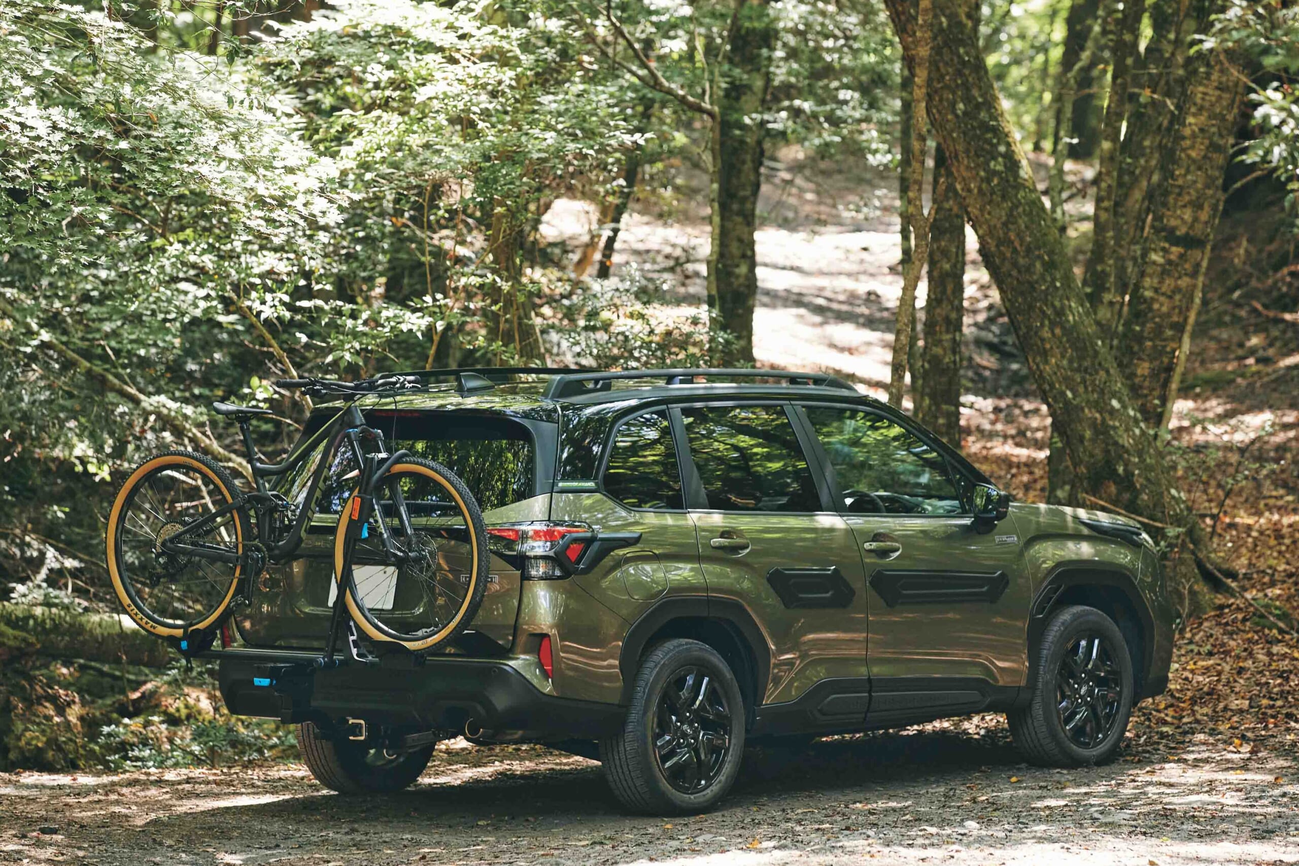 自然に囲まれたトラックを駆け抜けるマウンテンバイクを楽しむ三浦さん。“ロッキーマウント”のサイクルキャリアに愛車を乗せてお気に入りのトレイルへ。自転車を積載する場所といえば、ルーフトップを思い描くが、SUVなどの車高がある車種の場合、リアに取り付けるヒッチメンバータイプが、ここ最近のトレンド。前輪をアームで固定するだけでしっかり保持し、積み降ろしも楽々。「斜めに倒れるので、積載時でもゲートを開けて荷室にアクセスできるし、タイヤを外して収納する必要がないので、車内が汚れないのもいいですね!!」。
