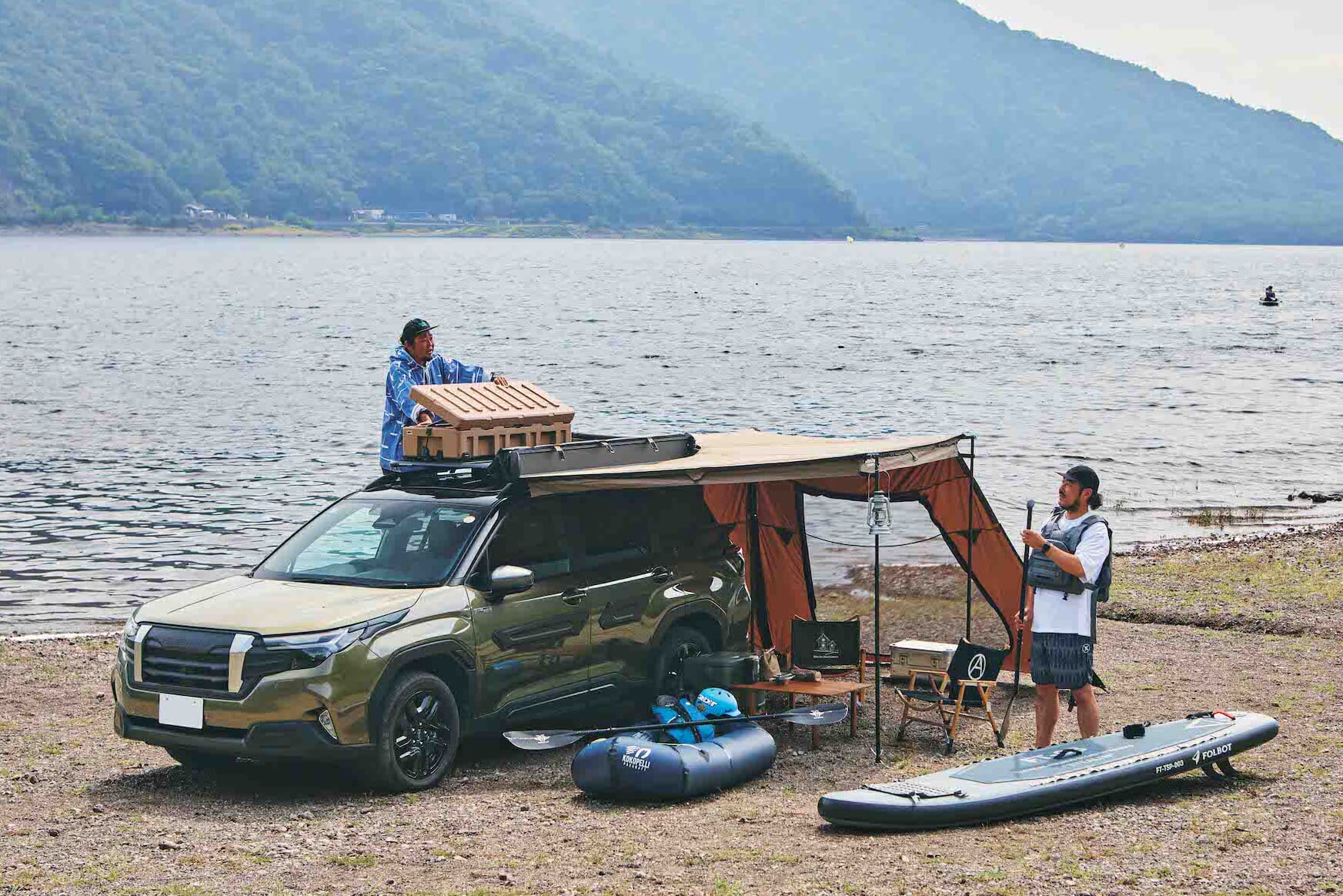 “ライノラック”のフラットなルーフラックと、日陰の少ない湖畔でのデイキャンプに最適な、サイドからリアまで包み込むように展開するオーニングでチルタイムを過ごし、ウォーターアクティビティを楽しむ二人。「ファスナーで簡単に取り付けられる横幕は、夏の暑さ対策だけでなく、風も防いでくれるので春秋にも活躍しますね」(あべさん)。「ルーフラックに積載した“リックスボックス”なら、パックラフトのギア一式収納できそう」(高梨さん)。機能的なカーギアに夢中になり過ぎて、湖面に浮かぶより使い方談義で盛り上がった様子。