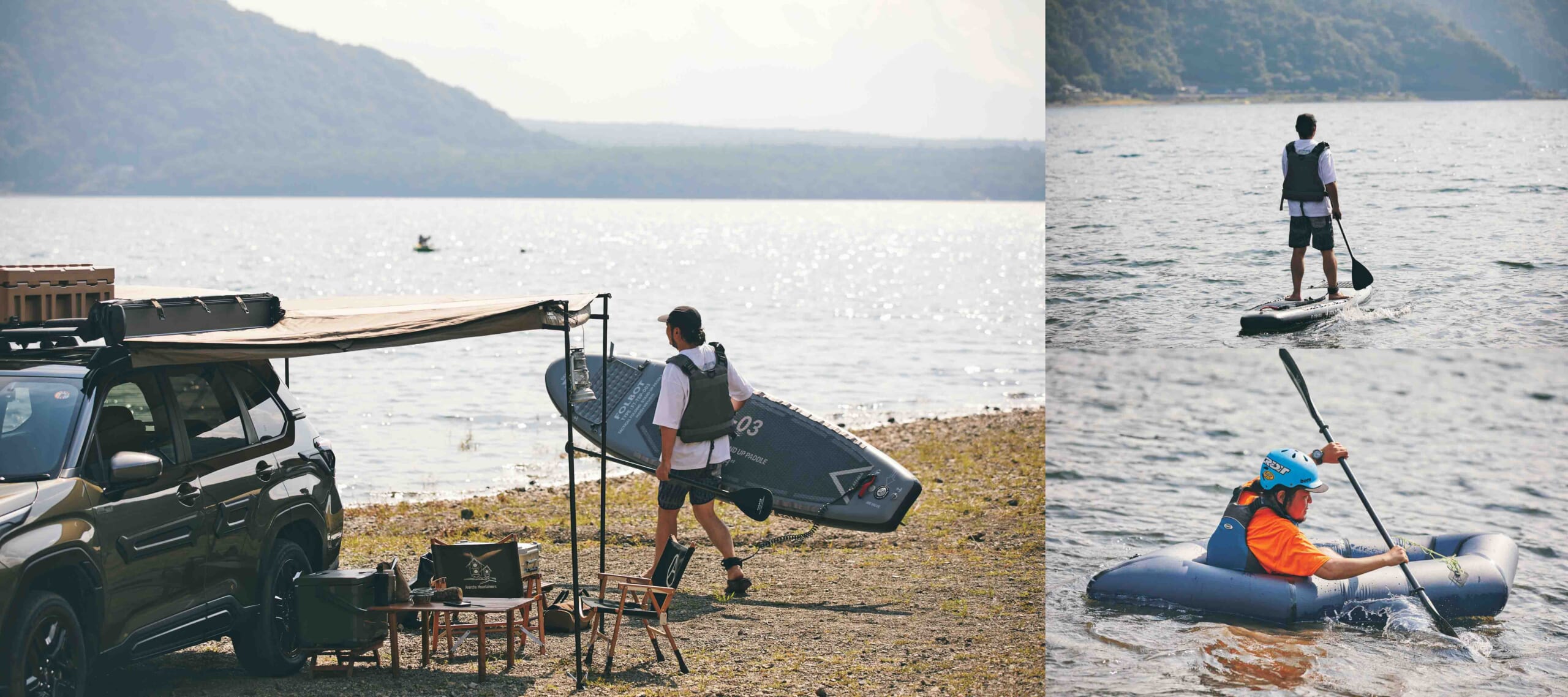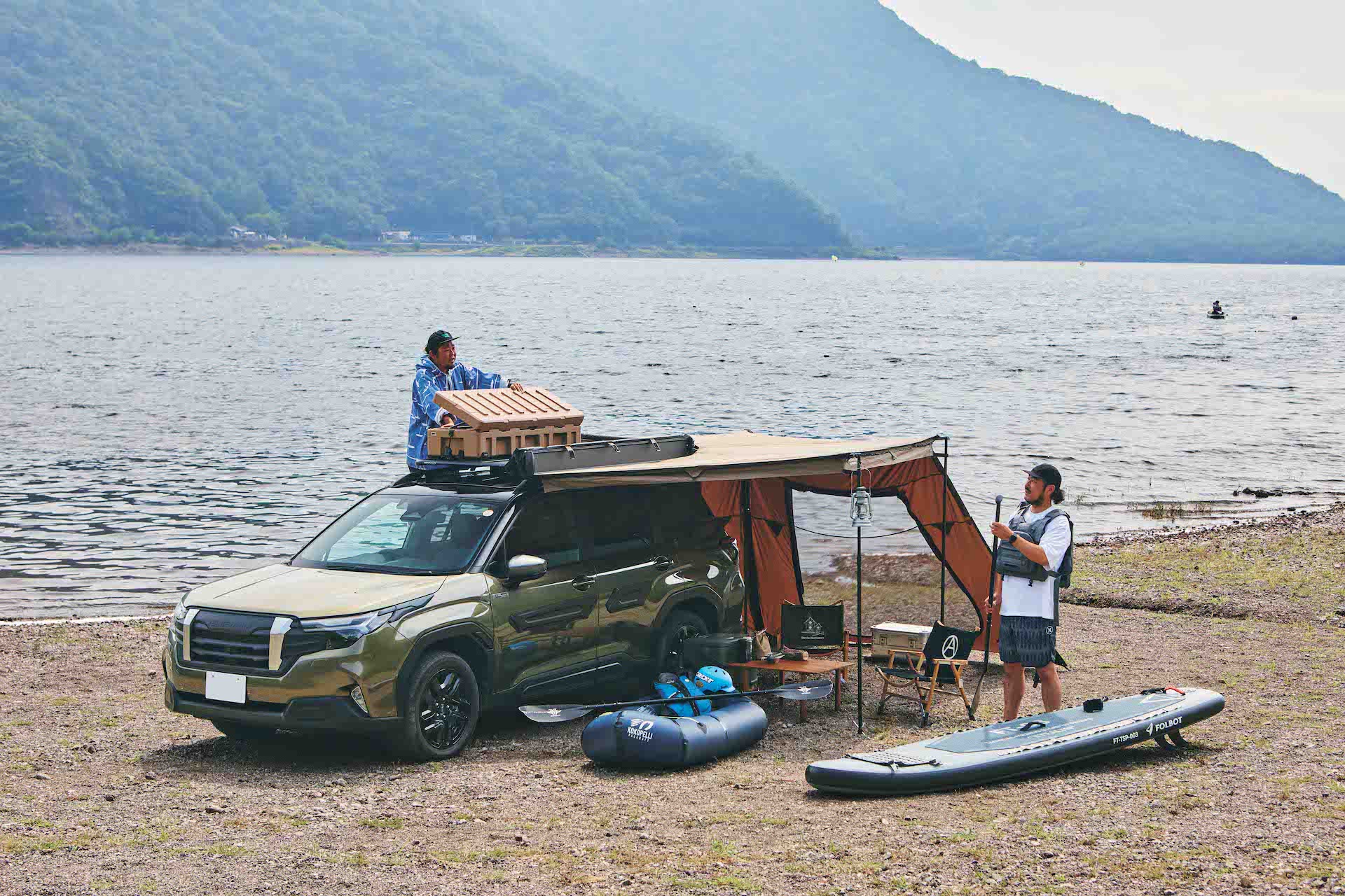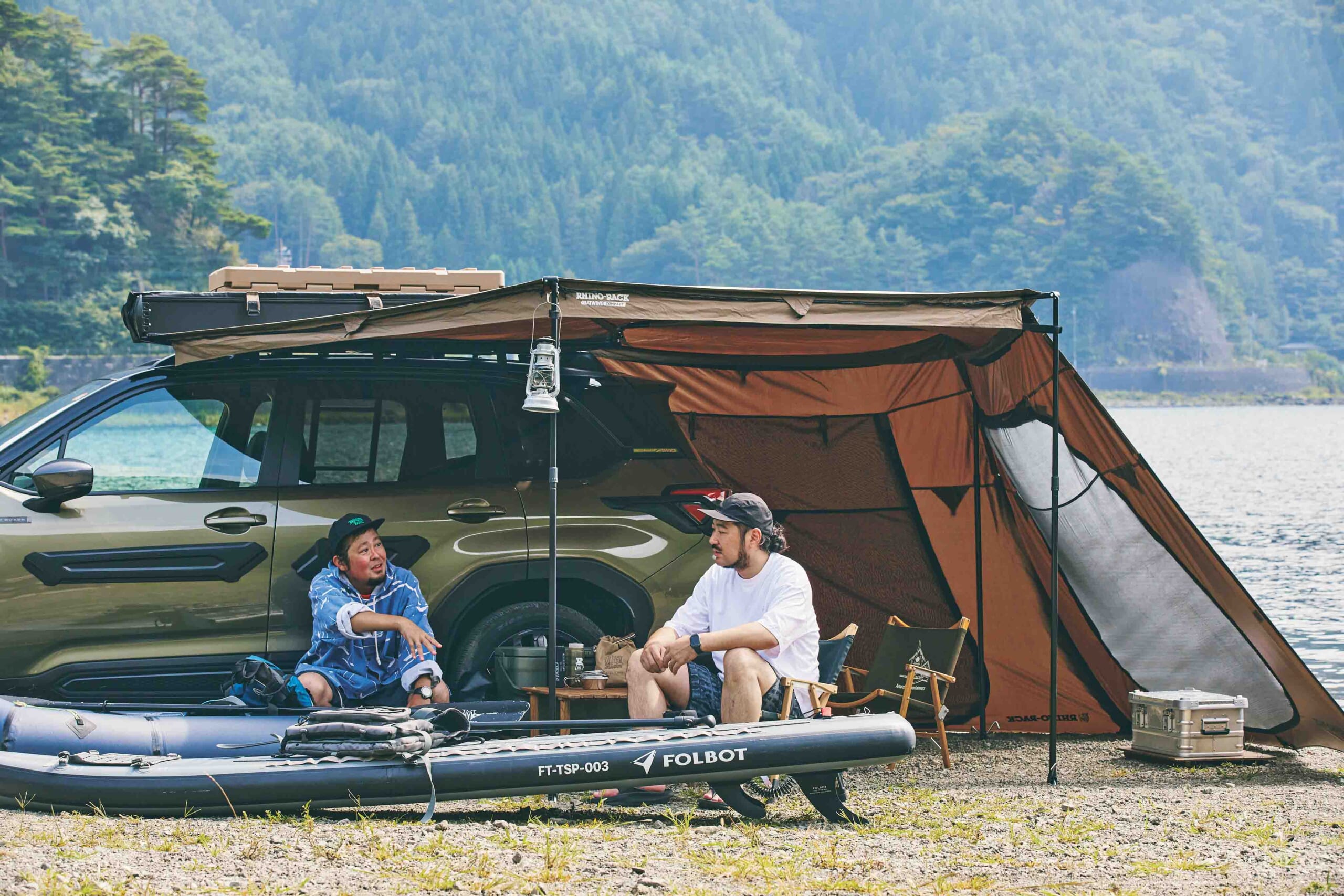 “ライノラック”のフラットなルーフラックと、日陰の少ない湖畔でのデイキャンプに最適な、サイドからリアまで包み込むように展開するオーニングでチルタイムを過ごし、ウォーターアクティビティを楽しむ二人。「ファスナーで簡単に取り付けられる横幕は、夏の暑さ対策だけでなく、風も防いでくれるので春秋にも活躍しますね」(あべさん)。「ルーフラックに積載した“リックスボックス”なら、パックラフトのギア一式収納できそう」(高梨さん)。機能的なカーギアに夢中になり過ぎて、湖面に浮かぶより使い方談義で盛り上がった様子。