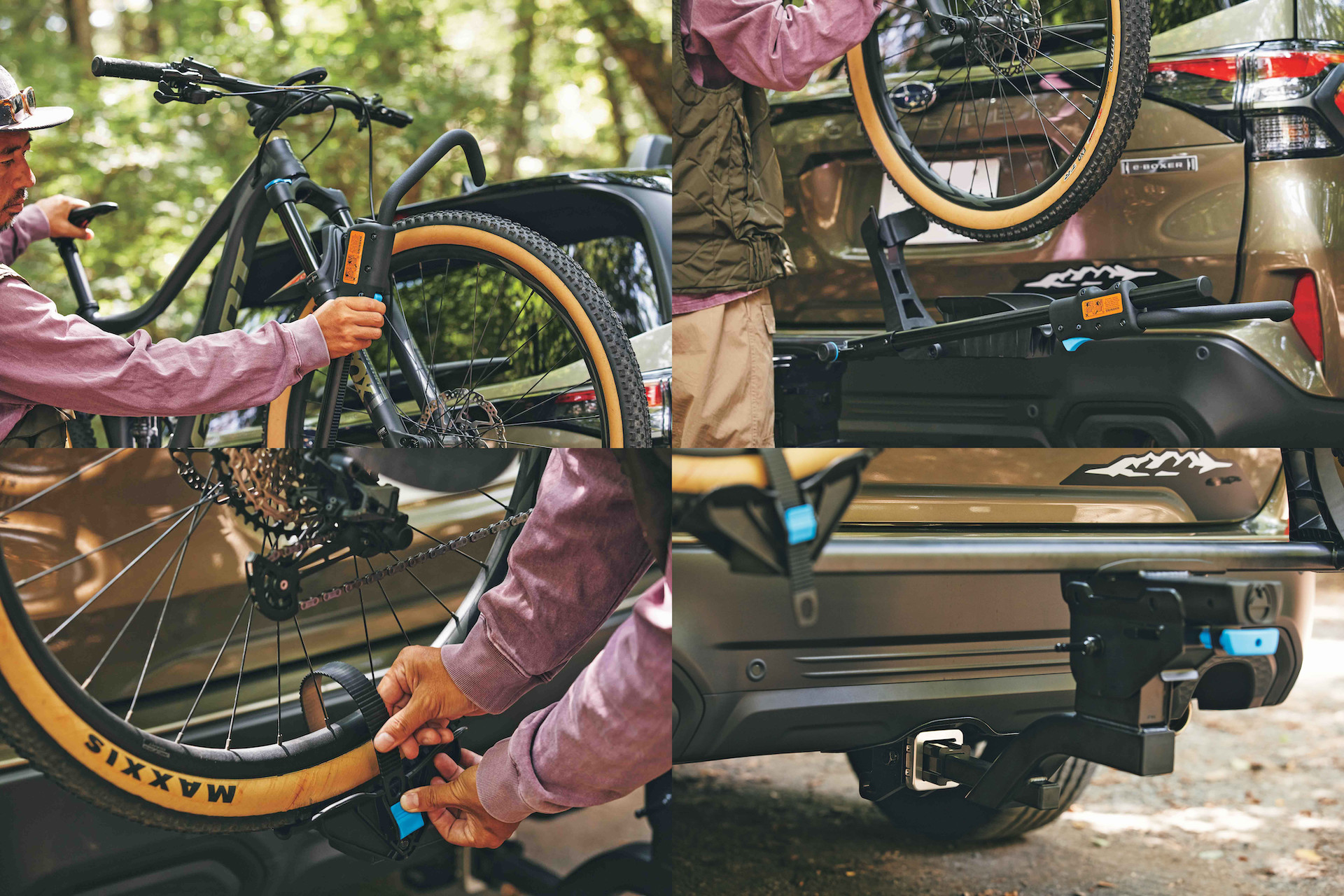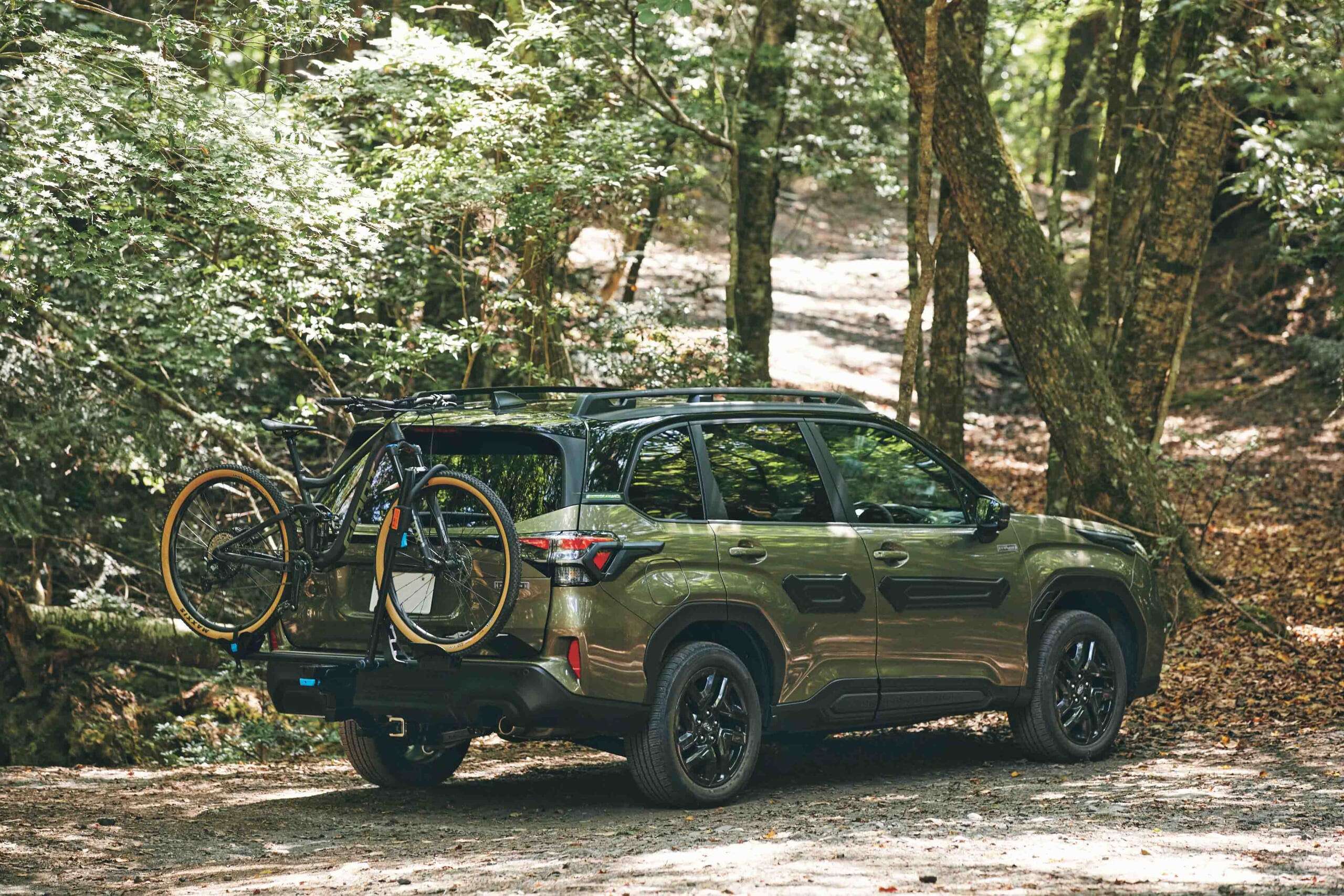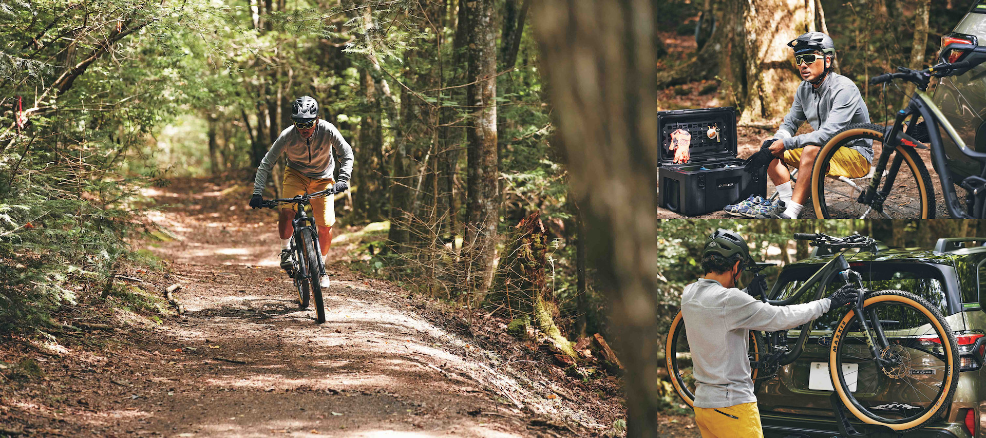 自然に囲まれたトラックを駆け抜けるマウンテンバイクを楽しむ三浦さん。“ロッキーマウント”のサイクルキャリアに愛車を乗せてお気に入りのトレイルへ。自転車を積載する場所といえば、ルーフトップを思い描くが、SUVなどの車高がある車種の場合、リアに取り付けるヒッチメンバータイプが、ここ最近のトレンド。前輪をアームで固定するだけでしっかり保持し、積み降ろしも楽々。「斜めに倒れるので、積載時でもゲートを開けて荷室にアクセスできるし、タイヤを外して収納する必要がないので、車内が汚れないのもいいですね!!」。