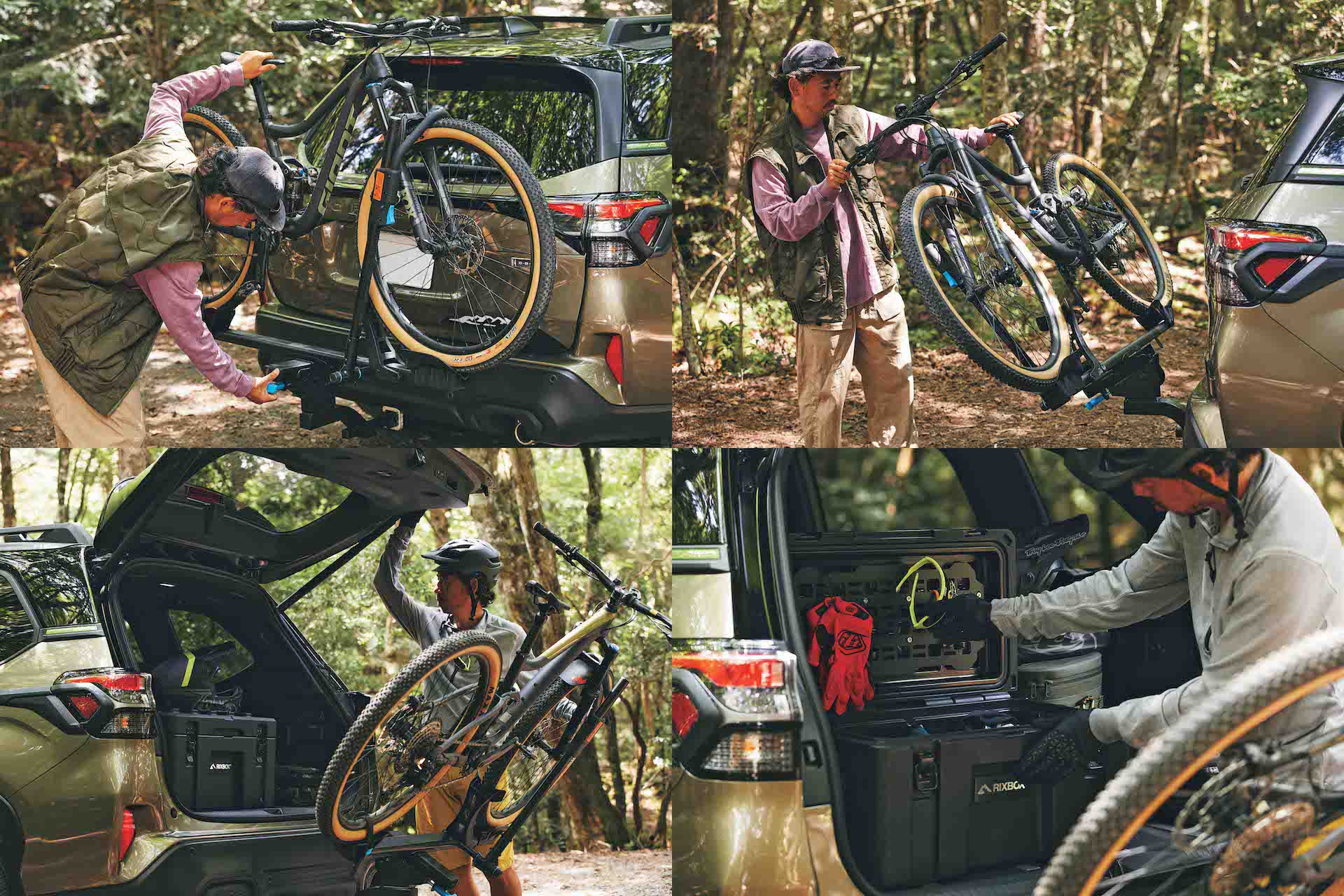リアエンドに取り付けられたサックスカラーのレバーを引くと、サイクルキャリアが斜めに可倒するチルト機構を採用。積み降ろしをラクにするだけでなく、この状態でバックドアが開閉できるので、そのままラゲッジ内のギアなどを取り出せる。タフな構造ながら、持ち運びやすいリックスボックス(53L)も活用。キャップ型ヘルメットやプロテクターなどのMTBギアを収納。小物類はフタ裏のモールパネルに取り付け。