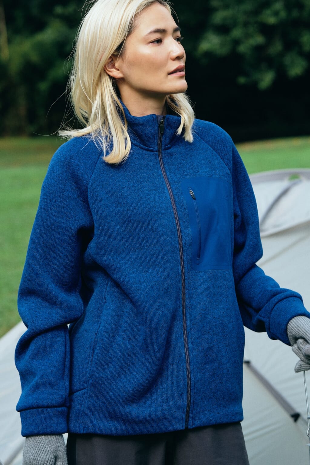 のんびりとハイクを楽しんだあとは、ミニマルなスタイルのデイキャンプを満喫。そんなチルアウトなひとときに、2人が色違いで着用するのは「ニットフリースジャケット」。