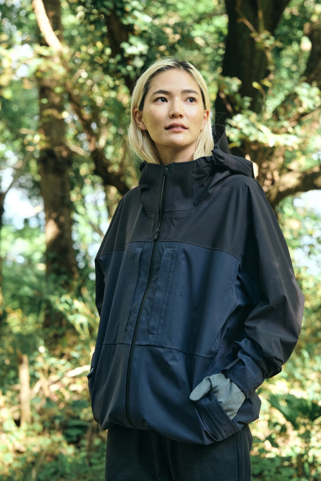 風間さんはシェルジャケット感覚で羽織れる「ブロックテックパーカバイカラー」を着用。表地、透湿膜、裏地の3層構造により、撥水性と防風性を完備し、男女問わず幅広いアクティブシーンに対応する。