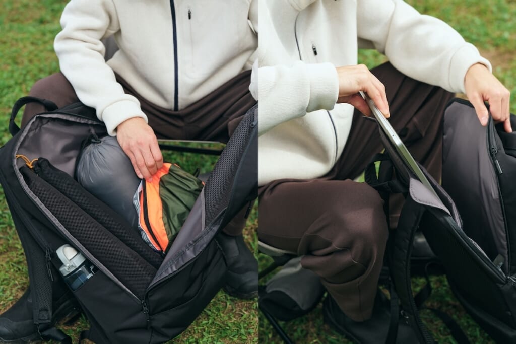 (左)メインコンパートメントは、U字ファスナー仕様。ガバっとフルオープンできるため中身が見やすく、必要なモノだけ取り出せる。(右)もちろんPCスリーブやオーガナイザーポケットも確保。出張等でも役立つ機能性を備えている。