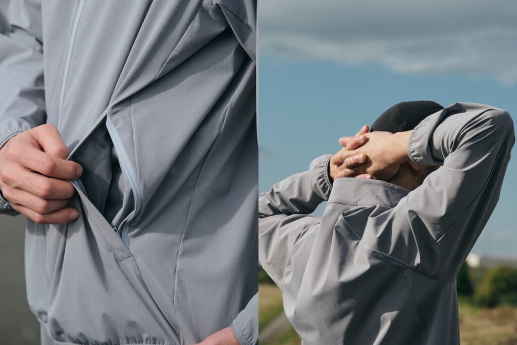 (左)ジャケットのポケットは、内部がメッシュ仕様。ファスナー付きなのもランニング時は嬉しい。開けることでベンチレーション効果も期待できる。(右)驚きの伸縮性を誇るウルトラスチレッチと立体的なデザイン、ラグランスリーブにより腕や肩も動かしやすい。