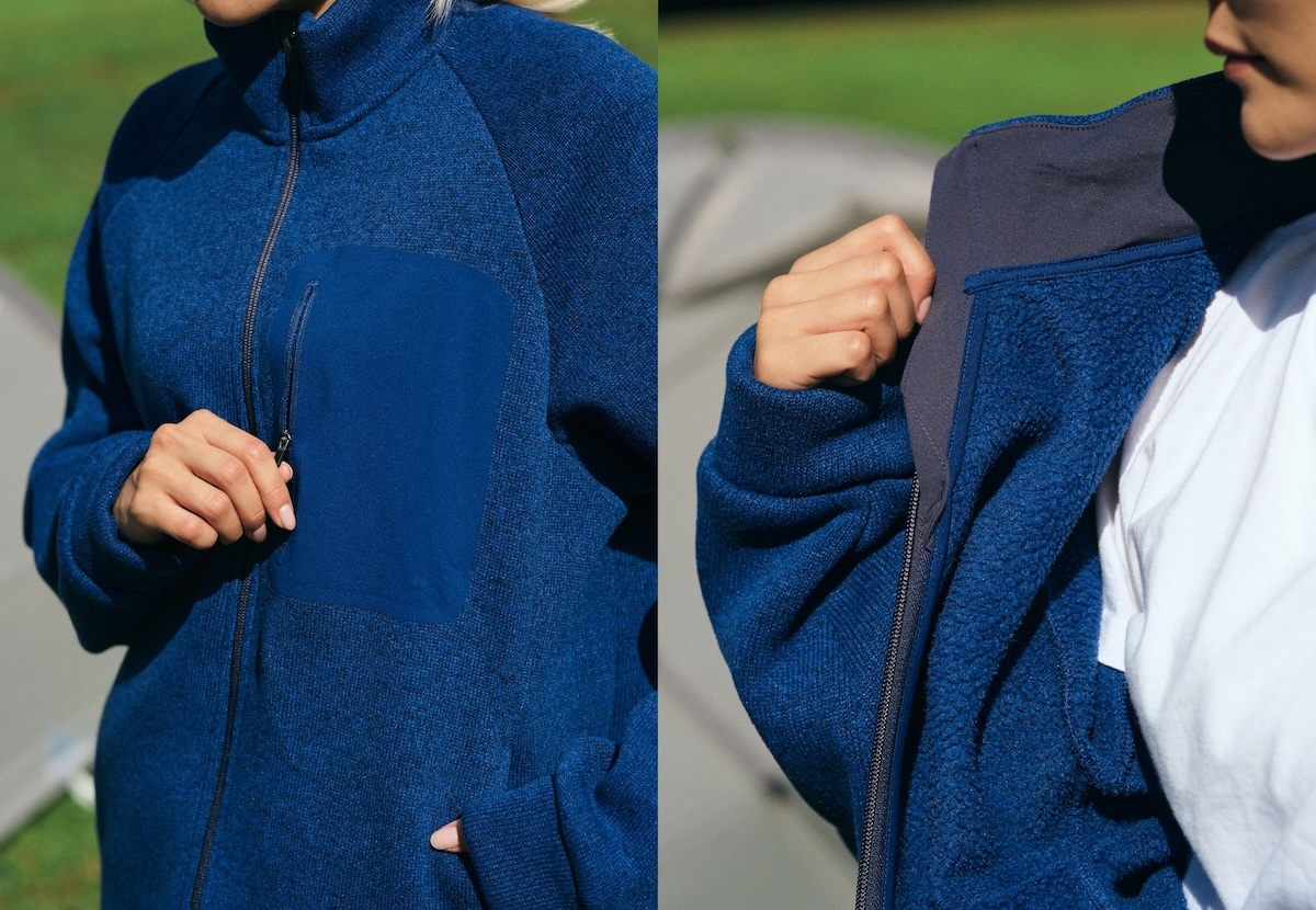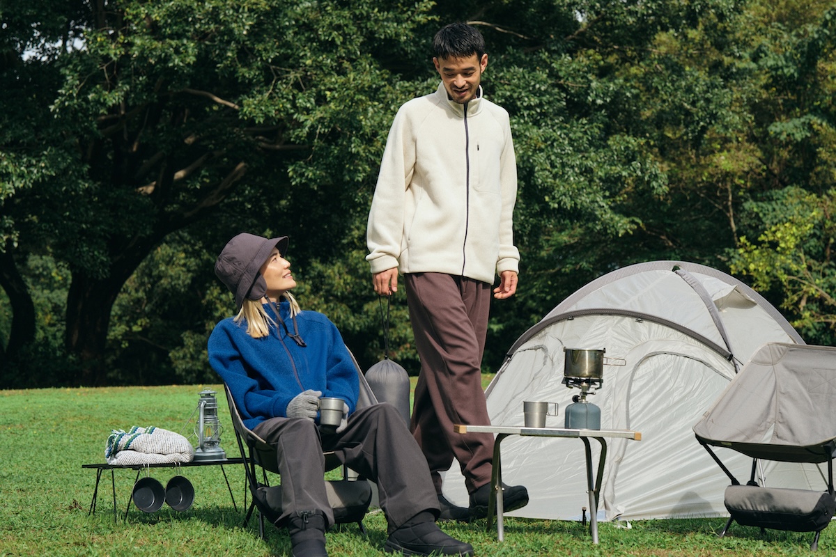のんびりとハイクを楽しんだあとは、ミニマルなスタイルのデイキャンプを満喫。そんなチルアウトなひとときに、2人が色違いで着用するのは「ニットフリースジャケット」。