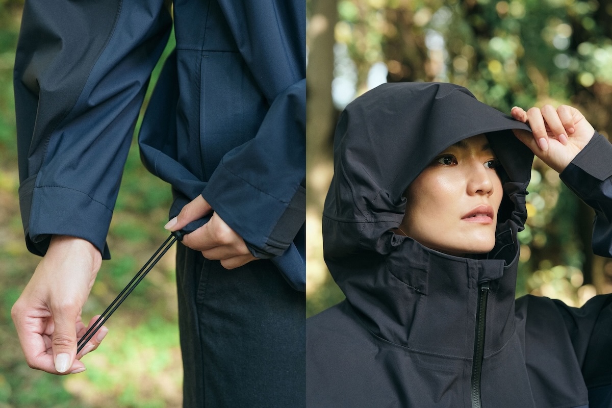 (左)裾にはドローコードを完備。フィット感やシルエットを自由に調整できる。(右)大きなフードは立体的な作りで、雨風が顔に当たりにくい。こちらもドローコードでシルエットを自由に調整可能。