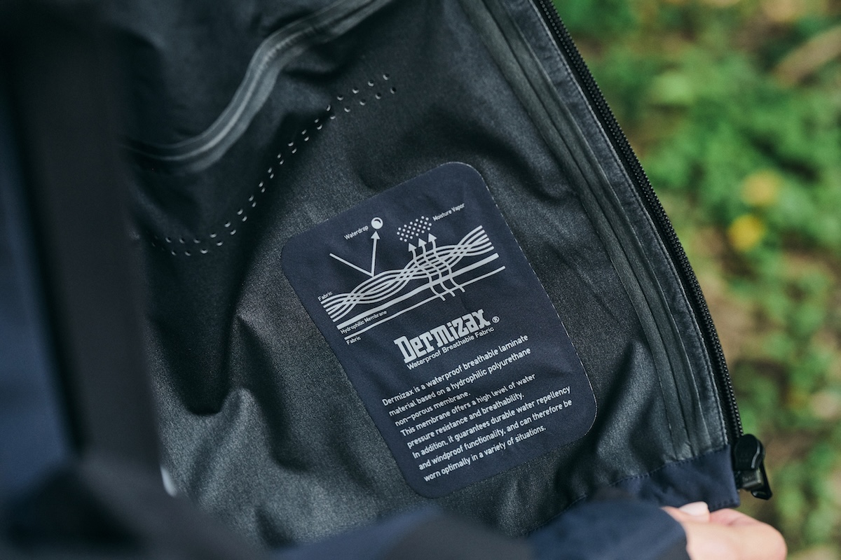 ボディには高いレベルの防水性、透湿性、低結露性を実現した、東レ独自の高機能機素材「Dermizax®」を採用。撥水性も高く、ドライな着心地をキープする。