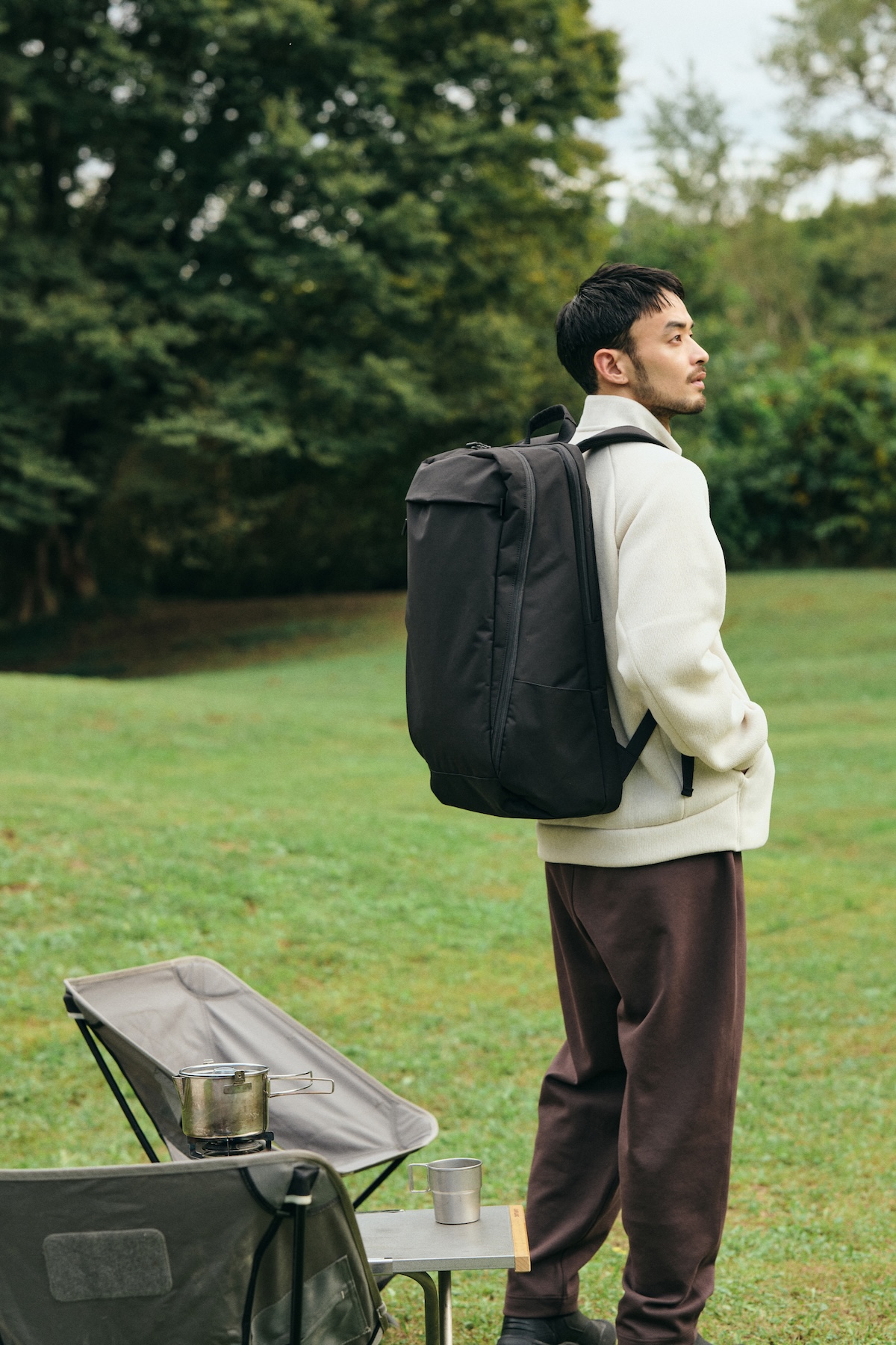 そんななか、影山さんは、同コレクションの「ファンクショナルバックパック」も投入。ブラックのワントーンで仕上げたアーバンなルックスながら、小雨を弾く撥水加工が施されているため、フィールドに持ち込んでも安心。