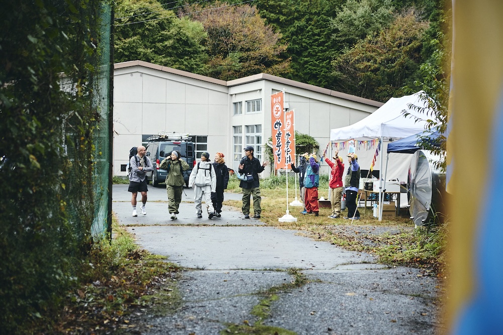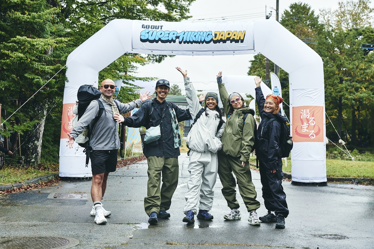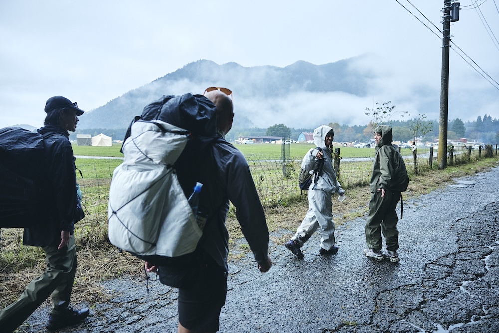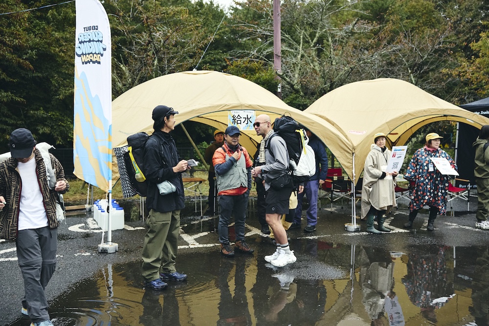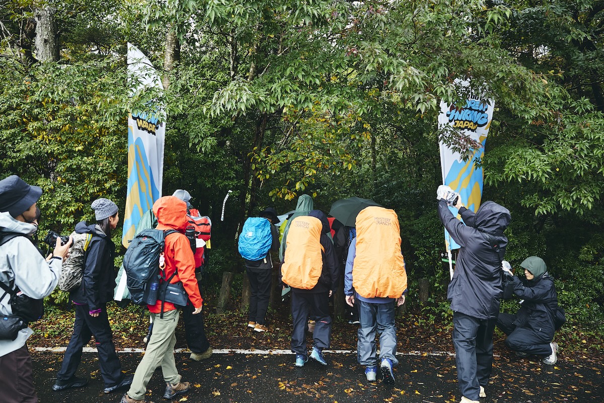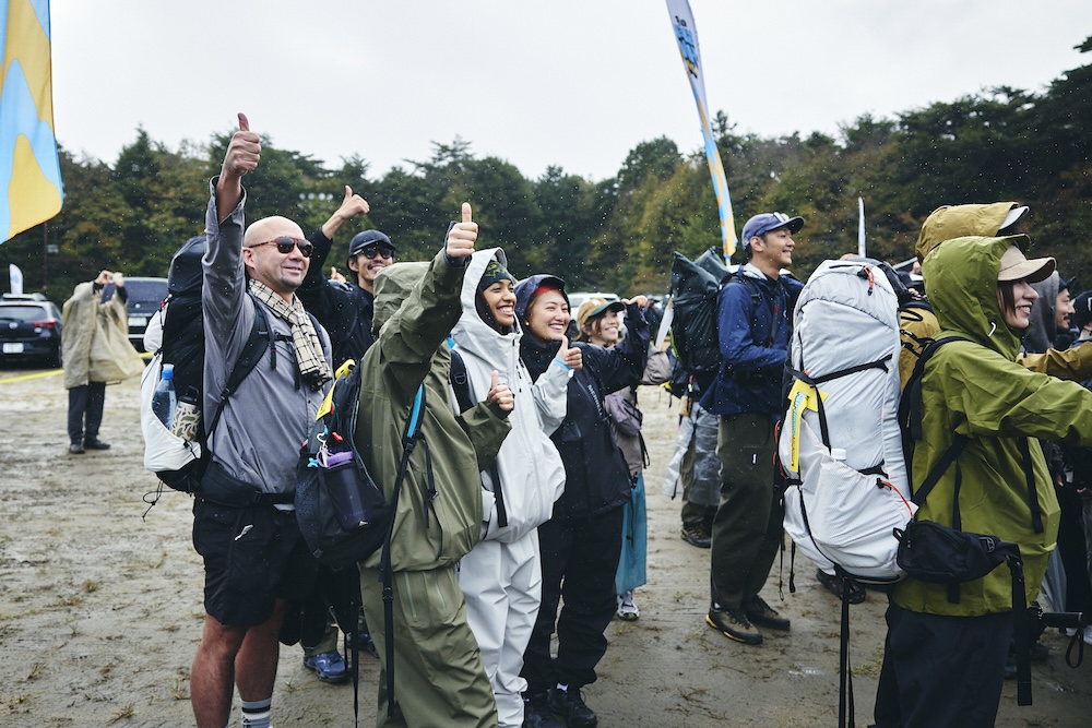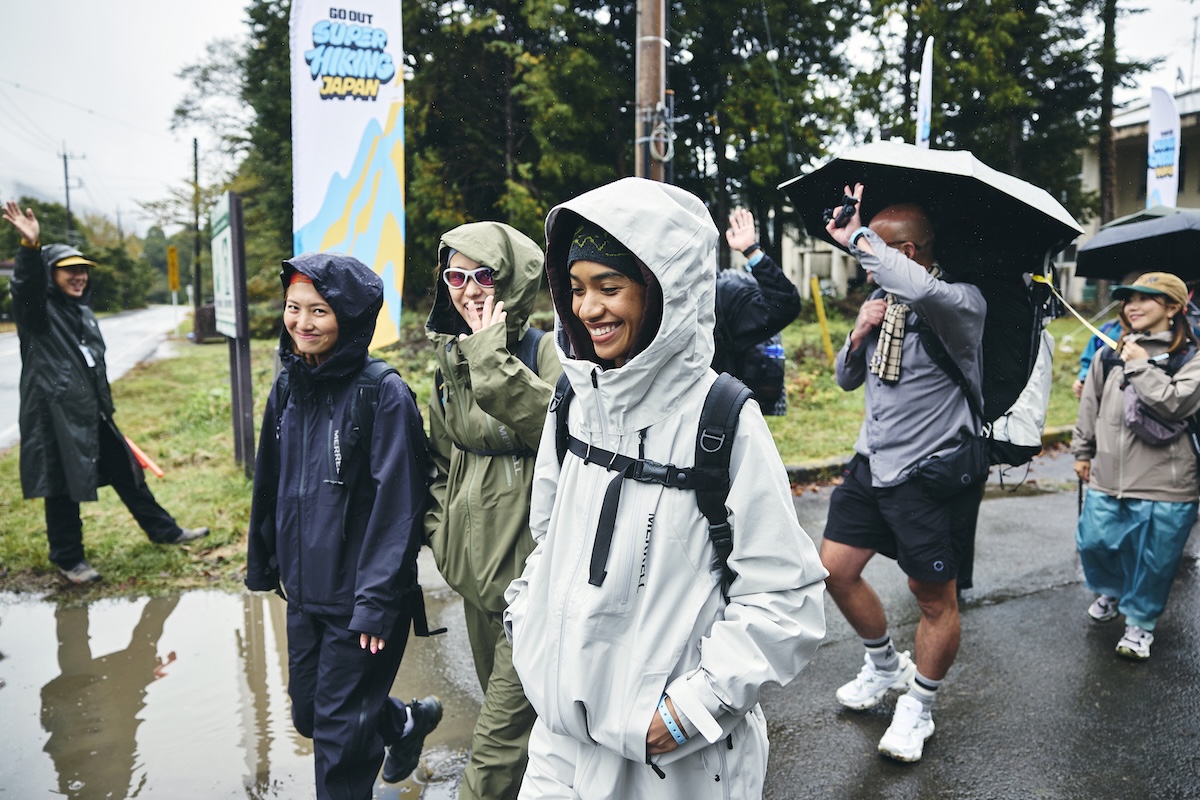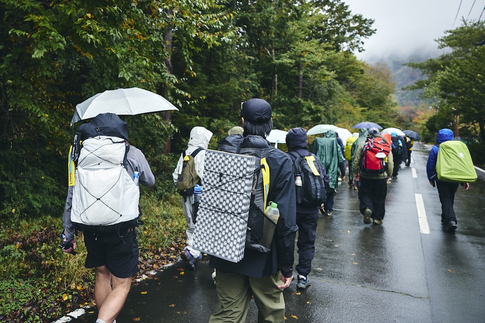 みんなで一斉にスタートするが、スーパーハイキングは、順位やタイムを競うイベントではないので、各自がマイペースに出発する。スタッフに「いってらっしゃい!」と手を振られ、雨のなか和やかに歩き出した。