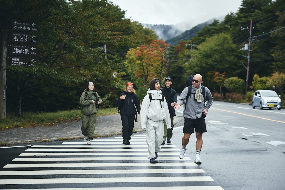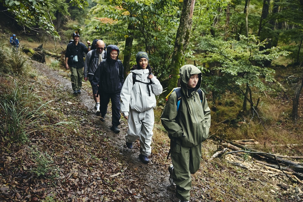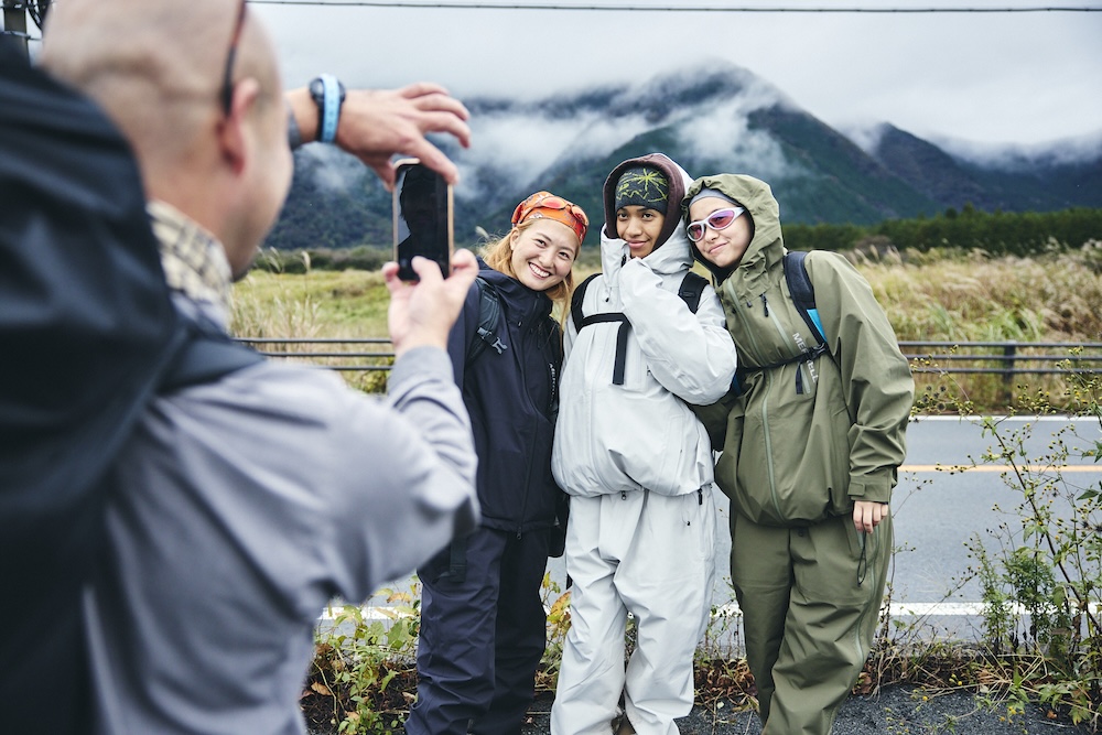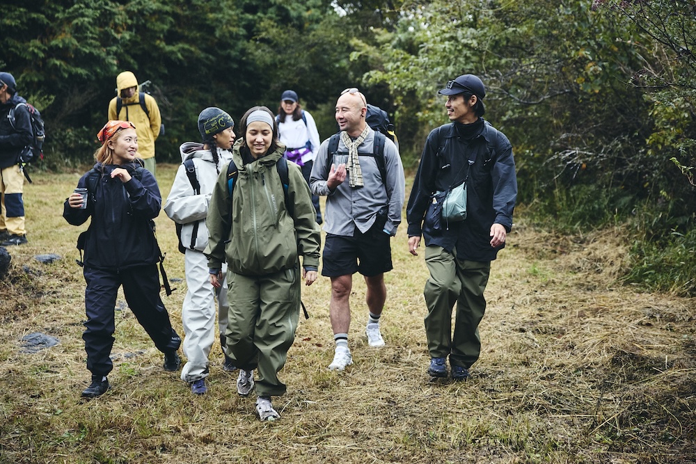 今回のメンバーは、GO OUT遊歩倶楽部のキャンさん&大桃さんに、メレル アウトドア クラブから駒井美月さん、SAKURAさん、Julieさんが合流した5人。当日は、あいにくの雨だったけど、降ったり止んだりを繰り返す小雨なので悲壮感もなく、みんな笑顔で元気いっぱい。