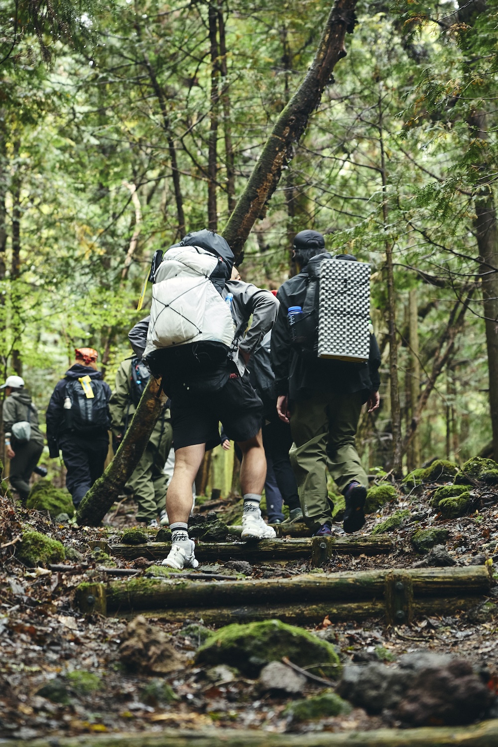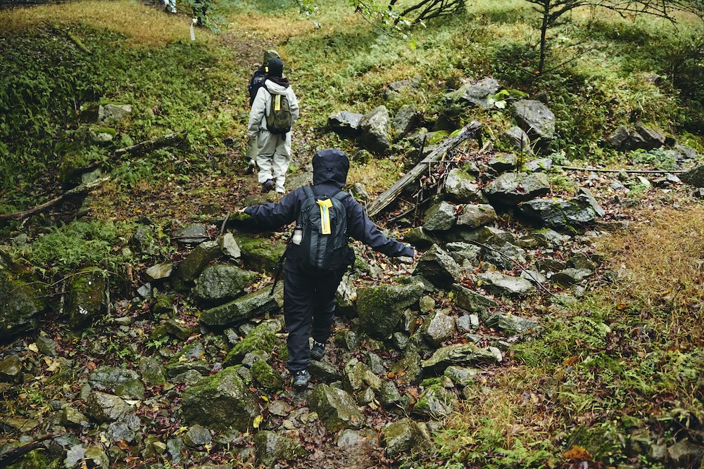 雨に濡れた朽木や轍など、滑りやすそうな場所では、早速メレルのシューズが大活躍。高い防水性を備えつつ通気性にも優れているため、5人とも蒸れることなく快適そう。確かなグリップ力も発揮していた。