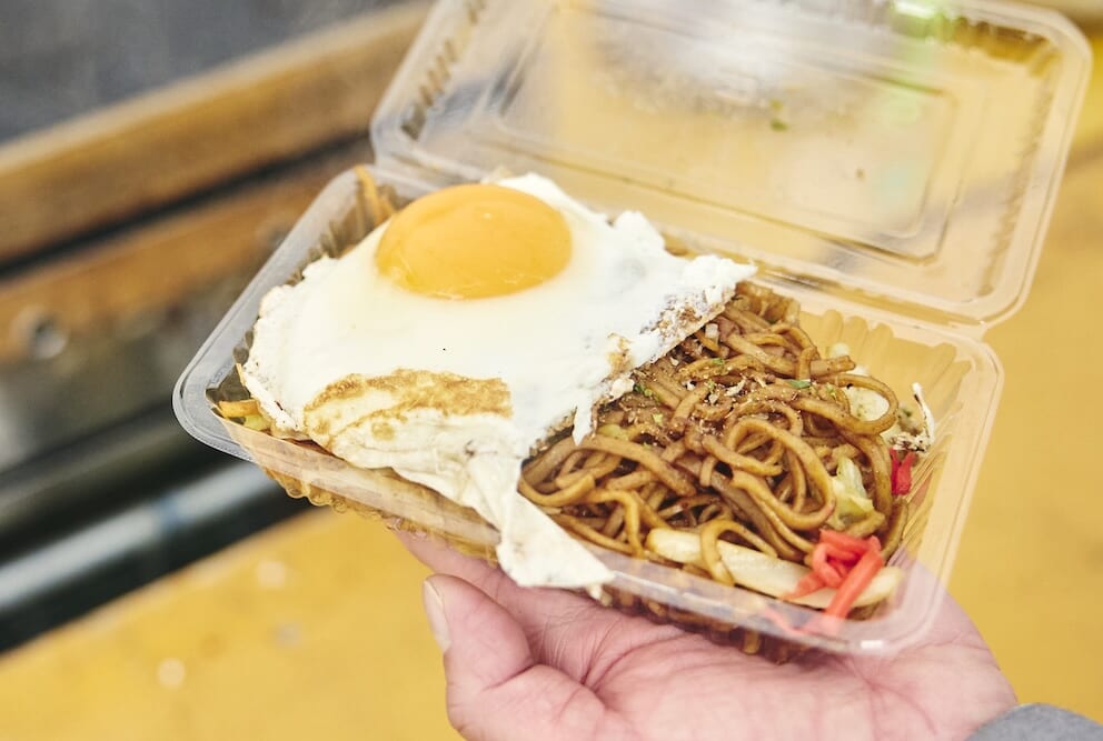 しかもスタッフがその場で鉄板で焼いてくれる上に、半熟の目玉焼きまで乗ったスペシャル仕様! お祭りや文化祭の屋台感も、食欲をソソられる。
