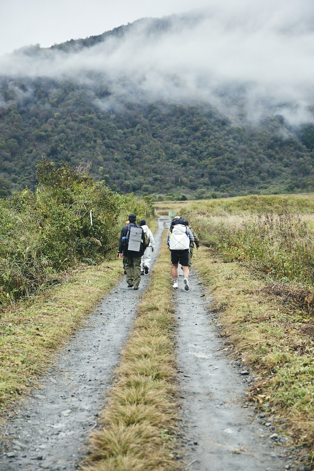 バックパックを背負ったハイカーたちの後ろ姿は、スタイルや個性の違いが一目瞭然。傘を差したり、ポンチョを着たり、フードを被ったりと、雨対策もさまざま。