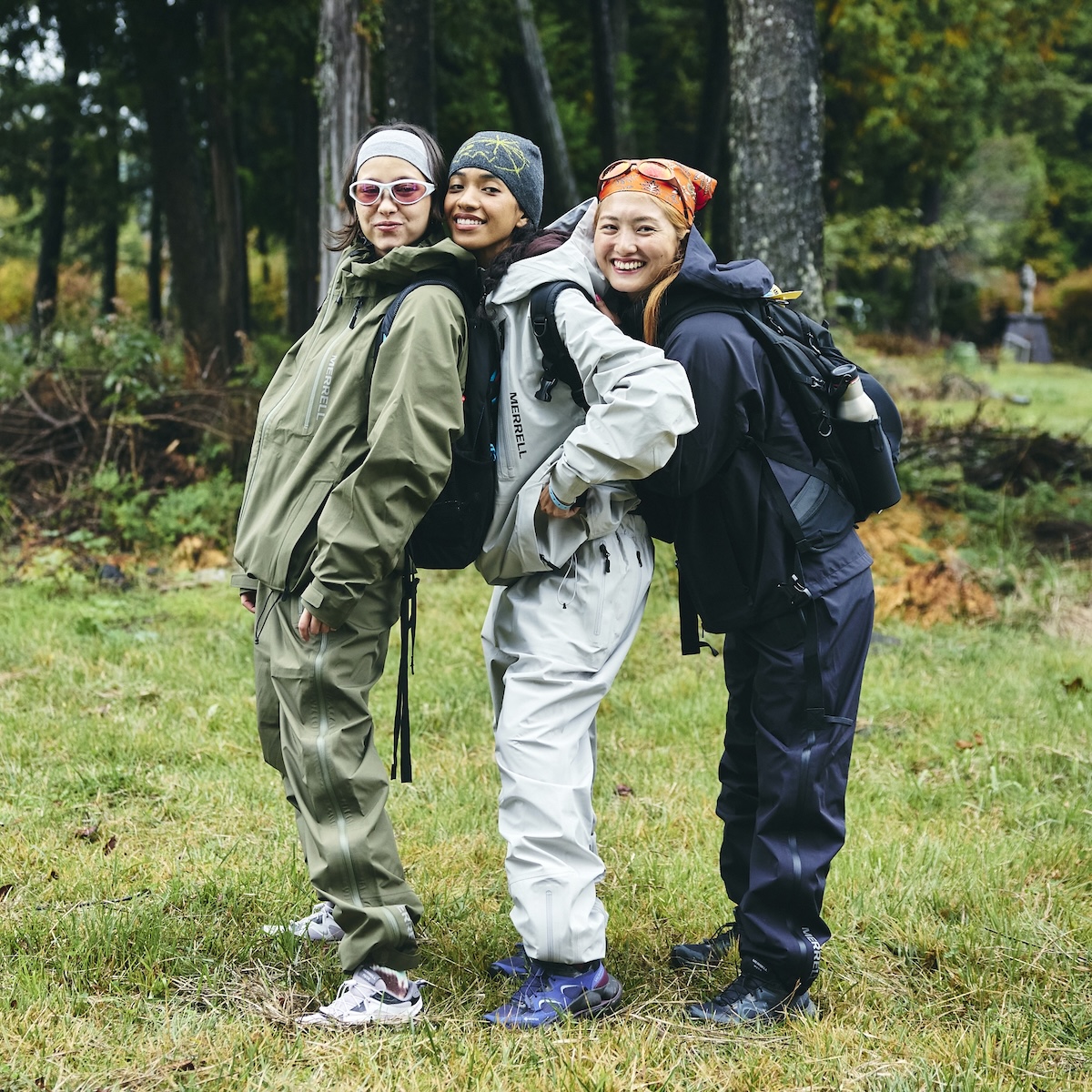そしてメレル アウトドア クラブは、色違いでお揃いのセットアップコーデを披露。メレルの新作アイテム「シンパテックス ユーティリティジャケット べント」と「シンパテックス ユーティリティ パンツ」を、レインウエアとしてスタイリッシュに着こなした、完全防水スタイル。