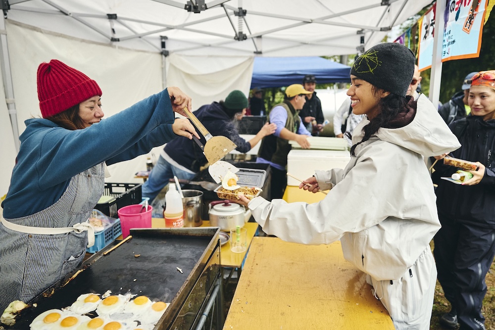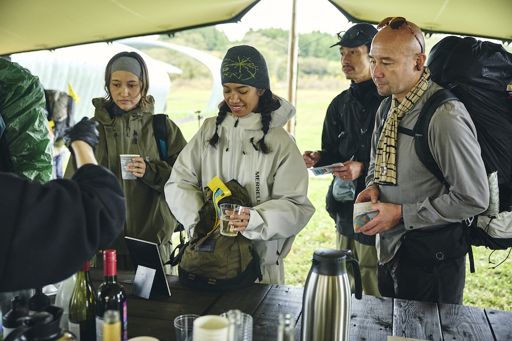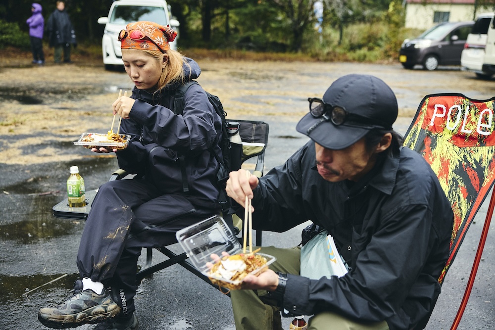 朝から4時間ほど歩き続け、ようやく辿り着いた休憩スポットで、みんなで食べる野外ランチは格別。タイミングよく雨も上がり、キャンプチェアに座ってゆっくり休憩することができた。