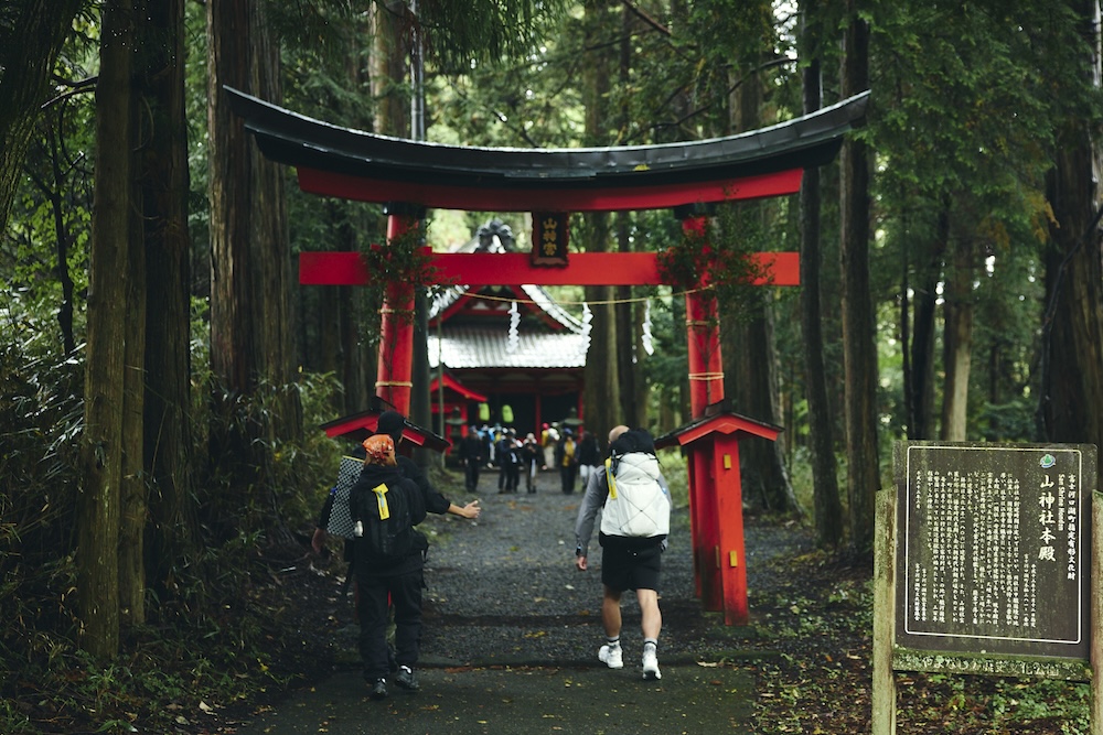 本栖湖のナイスビュースポットを横目に見ながら歩いていたら、コースの沿道に「山神社本殿」を発見。立ち寄ってもスルーしても自由だけど、「せっかくだから」と、ハイクの安全を願って参拝していくことに。