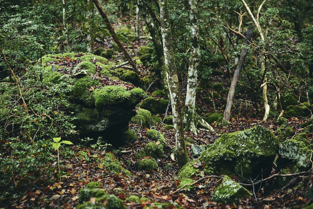 霧雨のなか、苔むした溶岩流が広がる樹海の散策路は、悠久の時を感じさせる原風景のようで、どこか神秘的。