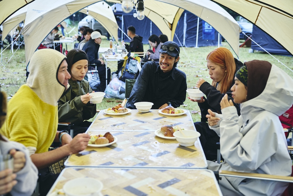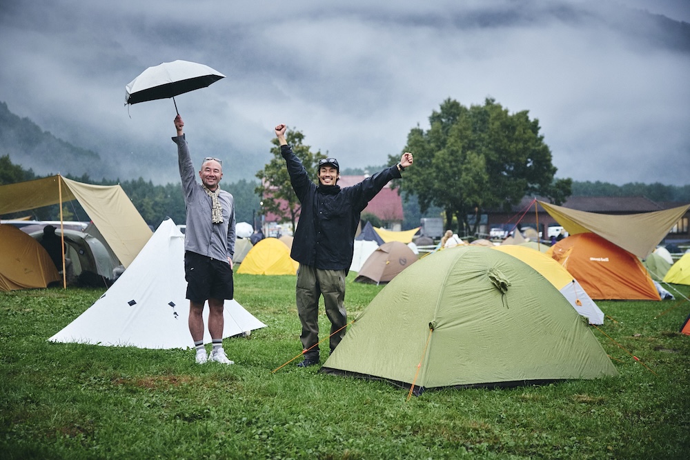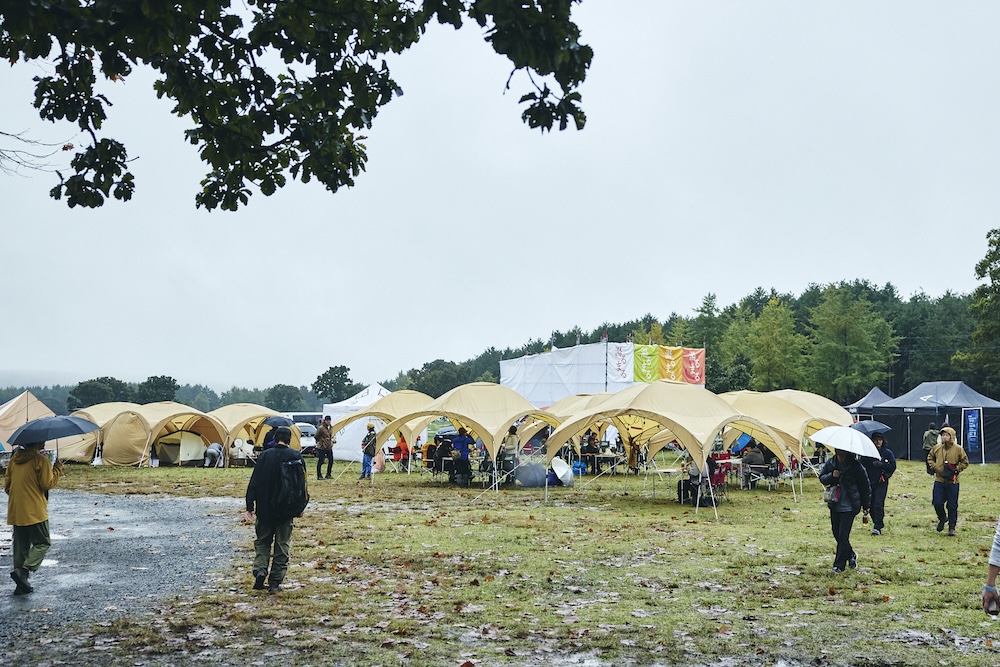 そして2日目も、あいにくの雨模様。前日と同じく小雨や霧雨なのでレインウエアでもカバーできるが、フィールドには食堂代わりのシェルターが用意されていた。
