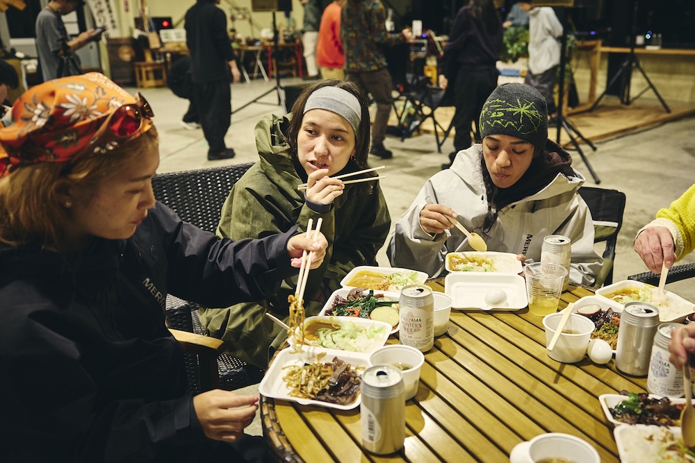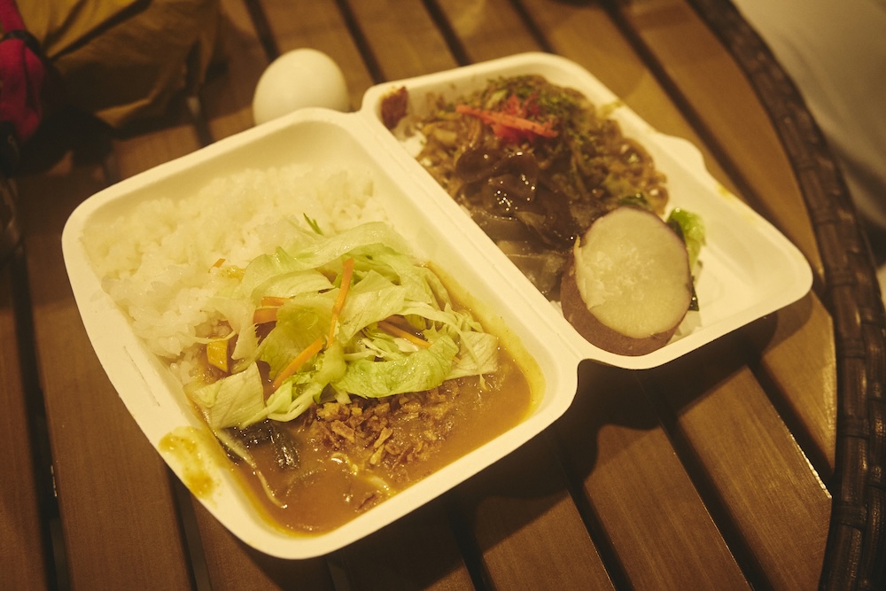 そして夕食は、地元の食材をふんだんに使ったカレー&焼きそば。ケータリングスタイルで、自由に盛り付けることができた。
