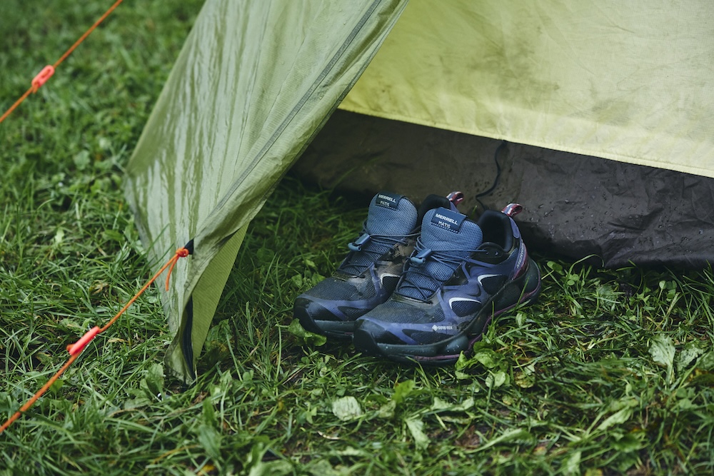 ハイキングの朝は早い。翌日は7時から朝食が用意されている。こちらはテント脇で静かに出番を待つ、メレルの「スピード アーク マティス ゴアテックス」。