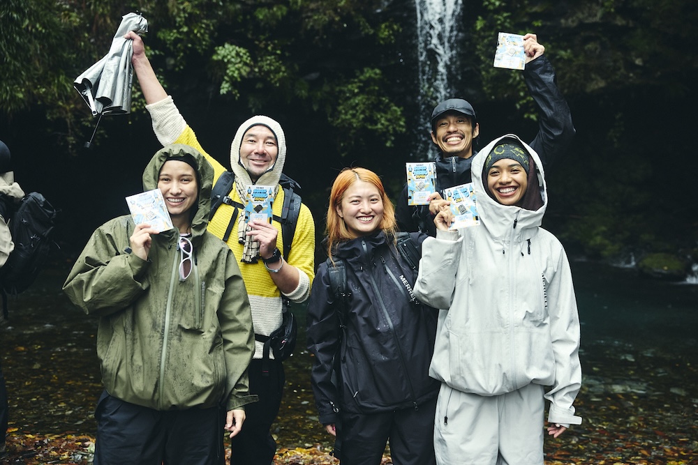 最後は完歩証バッジを片手に記念撮影! 樹海から里山まで、いろんな景色を楽しみながら歩いた2日間は、5人とっても忘れられない思い出になったのでは?