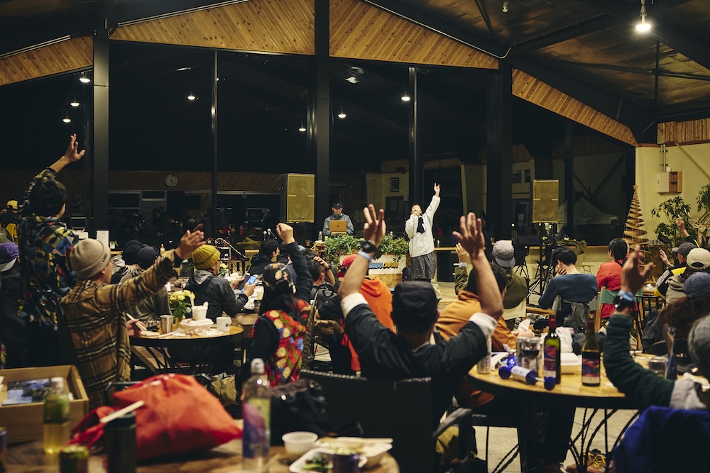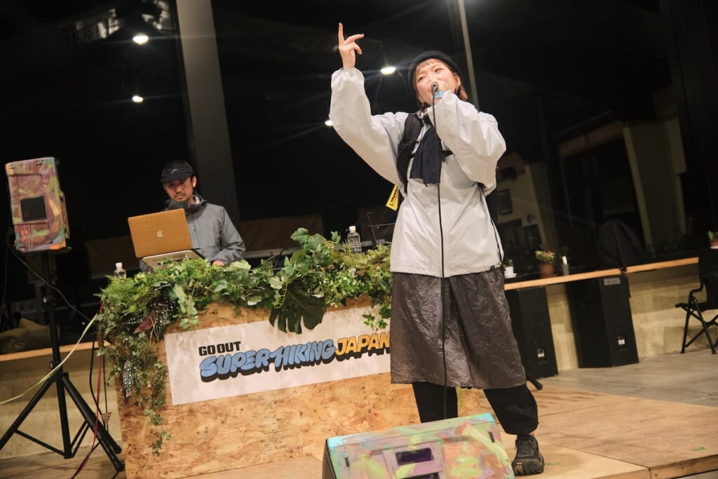 バックパックを背負ったハイクスタイルで歌ってくれたのは、シンガーソングライターのSOTOniさん。なんと、みんなといっしょにスーパーハイキングに参加して、精進湖から歩いて会場入りしたそう。