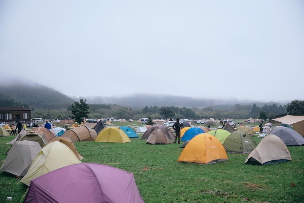 スーパーハイキングの参加者のエリアは、コンパクトな山岳テントが立ち並び、まるで北アルプスのテント場みたい。ふもとっぱらでは珍しい光景なのでは?