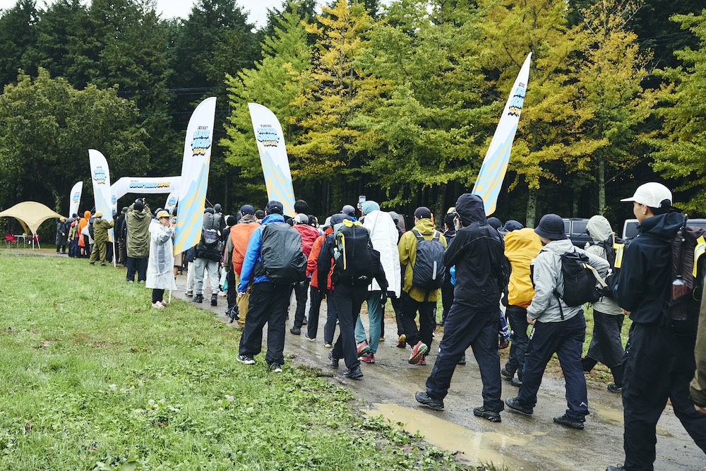 スーパーハイキングのコースは、「精進湖」から出発して、3つのチェックポイントを通過して、「ふもとっぱら」が1日目ゴール(ここまで前半)。「ふもとっぱら」でさまざまなコンテンツを楽しみ、夜はテント泊。翌日に「陣馬の滝」まで歩く、約27kmのトレイルとなる。