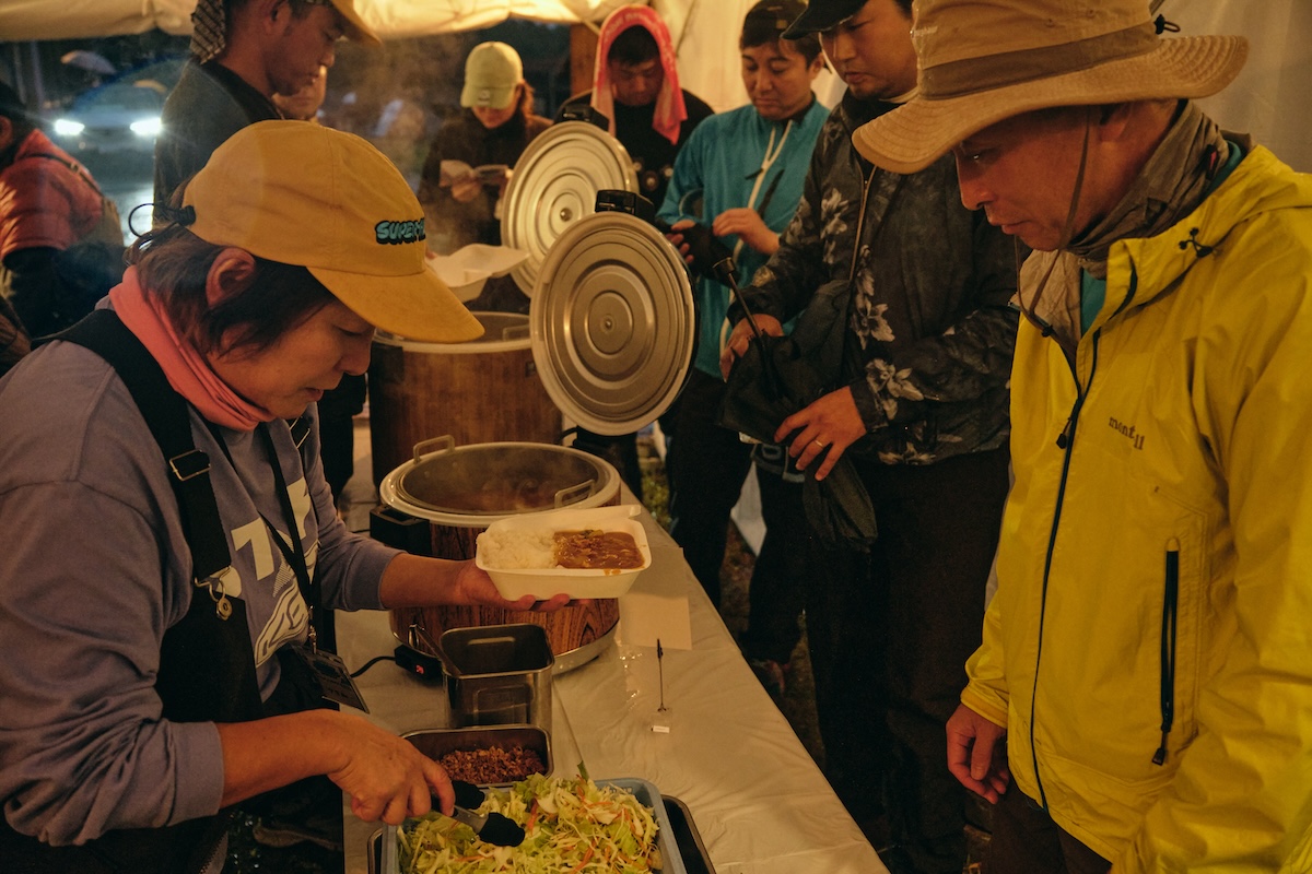 そして2日目も、あいにくの雨模様。前日と同じく小雨や霧雨なのでレインウエアでもカバーできるが、フィールドには食堂代わりのシェルターが用意されていた。