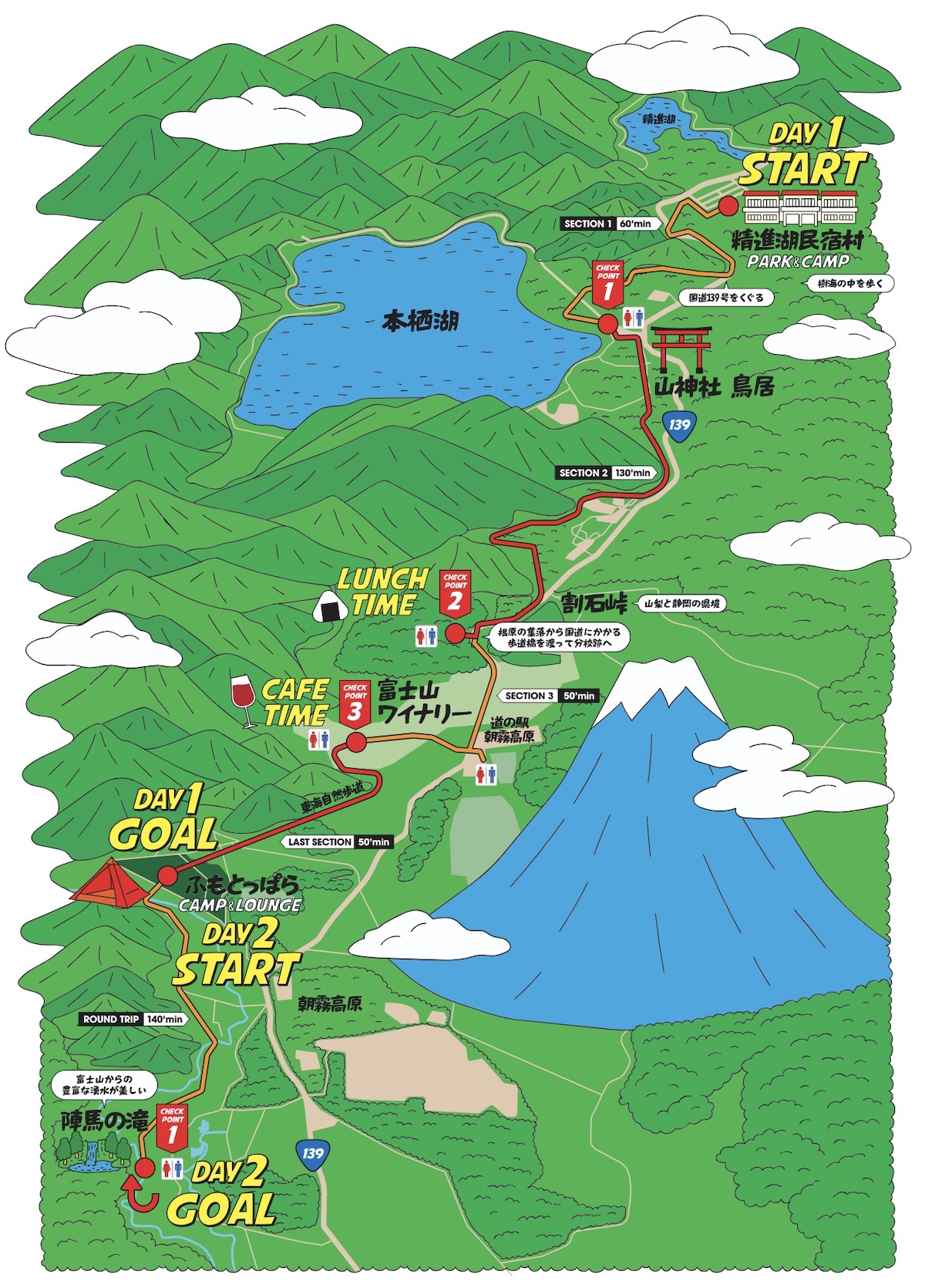 スーパーハイキングのコースは、「精進湖」から出発して、3つのチェックポイントを通過して、「ふもとっぱら」が1日目ゴール(ここまで前半)。「ふもとっぱら」でさまざまなコンテンツを楽しみ、夜はテント泊。翌日に「陣馬の滝」まで歩く、約27kmのトレイルとなる。