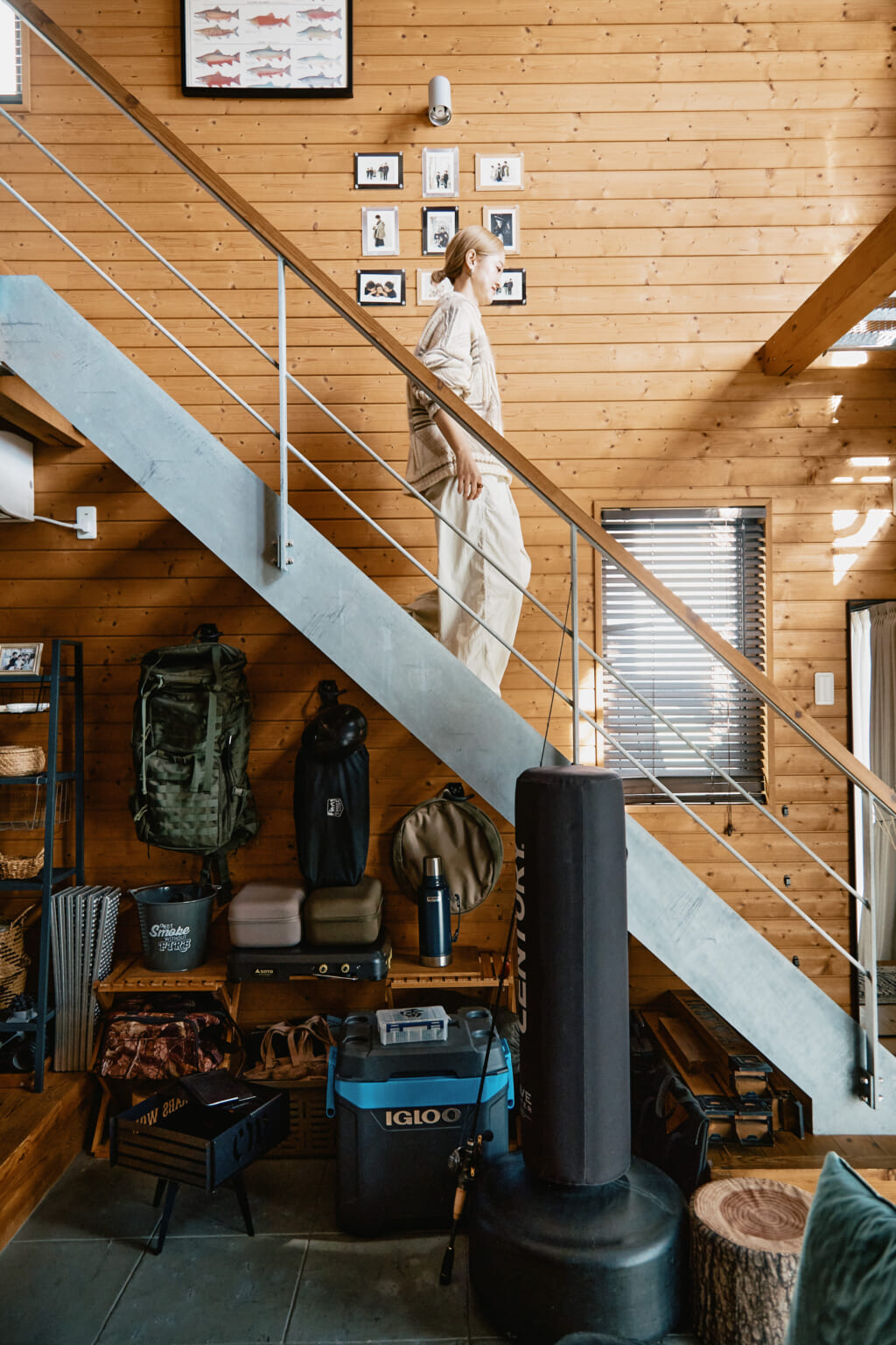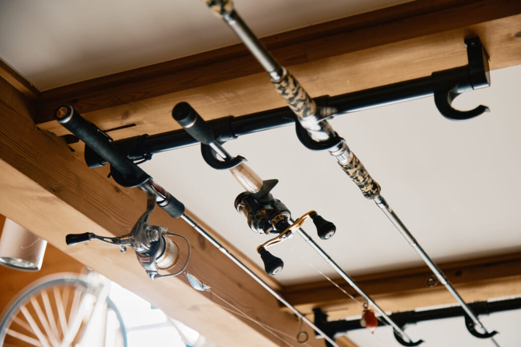 真也さんはこの家を建てたエリアが地元。学生の頃からクルマで1時間ほどの場所が、雷魚が有名なスポットで、最近は友人と釣りへ行く機会が増えたとか。「釣りの道具は海から渓流、バス釣りまでひととおり揃っています」。土間の天井にはロッドホルダーを設置し、収納スペースとしても活用。