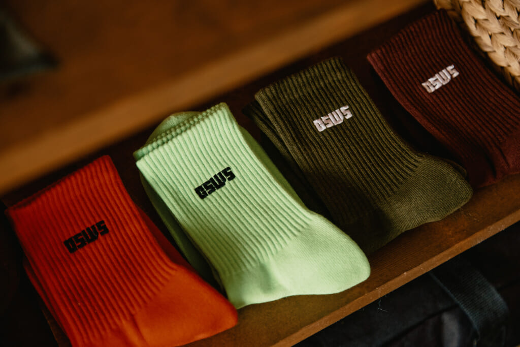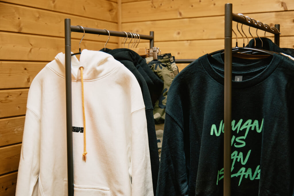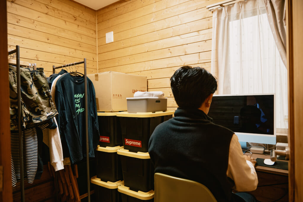 これらのアイテムは、休日などの空いた時間を使い真也さんがデザイン。土間の横にある小部屋は在庫管理とデザイン作業用スペースとして活用。ギアのほかにもアパレルなどを展開し、最近は地域のマルシェなどに出展している。「ブランド名の由来は地元・蟹江町を文字ったもの。ギアを作る工場も地元ですし、少しでも地域を盛り上げられるようにと思い、今は活動しています」。
