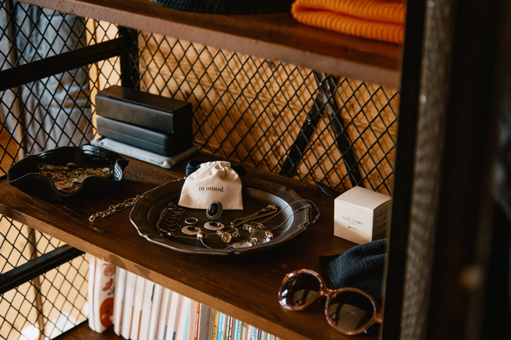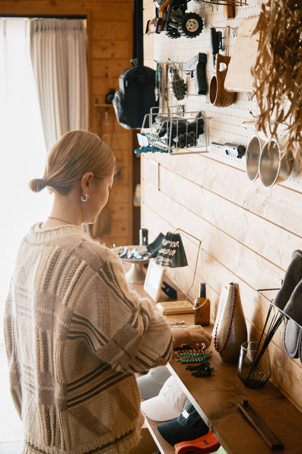 ギアだけでなく、かおりさんのお気に入りも上手に取り入れながらディスプレイされているのもポイント。「いつもは奥さんが家を整えているので、ディスプレイもよく変更されています(笑)」とのことで、最近かおりさんがハマっているヴィンテージビーズを使った手作りのアクセサリーなど、ふたりの趣味が違和感なく溶け込んでいます。