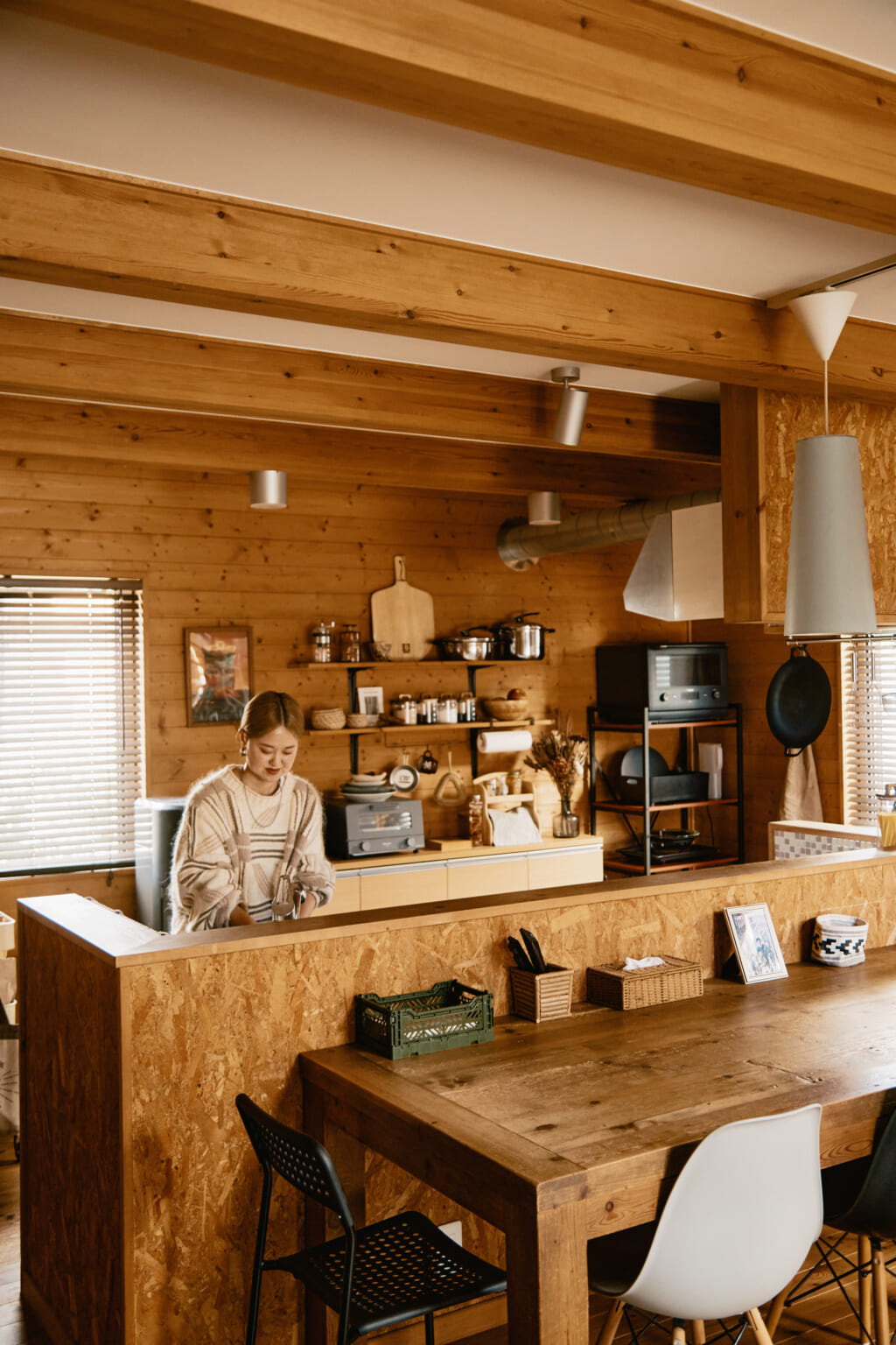 展示場で見たモデルルームの雰囲気がとても気に入ったこともあり、階段やロフトの手すりはグレーチング棚と同じスチール素材をチョイス。「ログハウスのような雰囲気もいいですが、一部を変えるだけでスタイリッシュになると思って。変えて正解でした!」。ほかにもダイニングやキッチンに付けたライトまでモデルルームと同じものをオーダー。