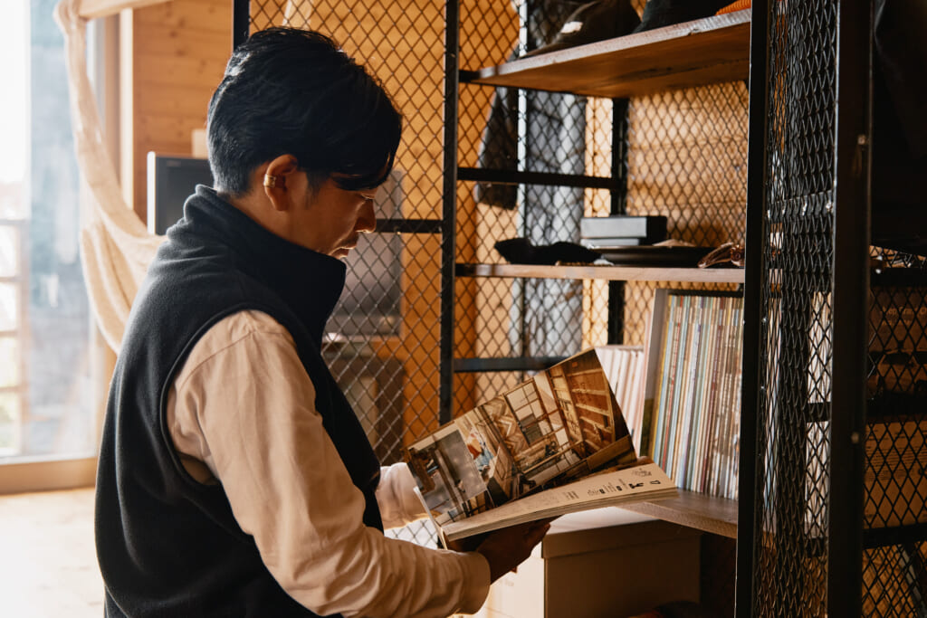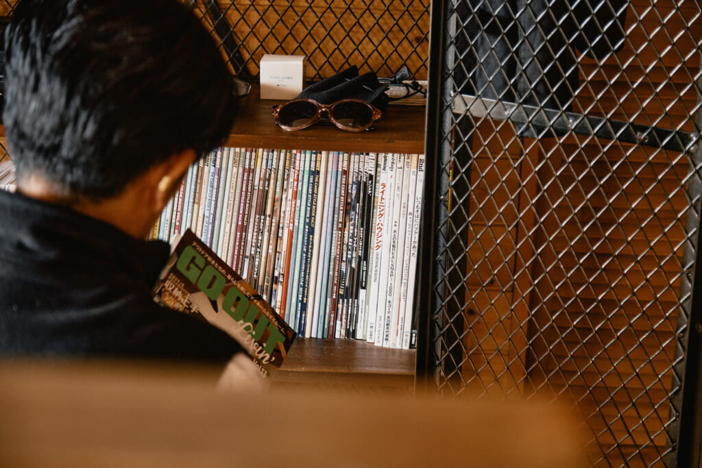 ロフトの一部にも夫婦のお気に入りが。メッシュのブラックスチールラックには、ふたりの好きなファッション関連のアイテムだけでなく、集めている別冊ゴーアウトのバックナンバーが並びます。「インテリアのアイデアを探したり、キャンプシーズンが始まる前にテントサイトをイメージするために読み返します。過去に見た内容も、見返す度に発見がありますよ」。