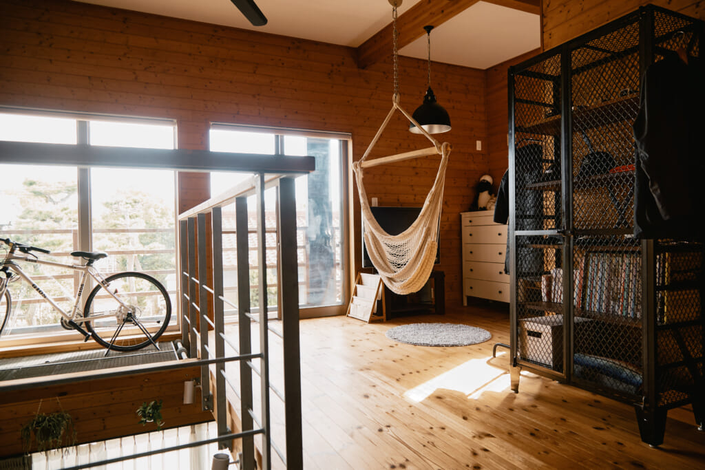 夫婦の好きが凝縮された“土間”だけでなく、家族にとっても楽しみが散りばめられた伊藤家。子どもたちの成長に合わせ、2階は2部屋あるうちのひとつを兄と弟が使う部屋として、“ロフト”を妹のスペースとしてレイアウト。ここに吊り下げられたハンモックは、のんびりすることも遊ぶこともできるため、子どもたちから大人気!