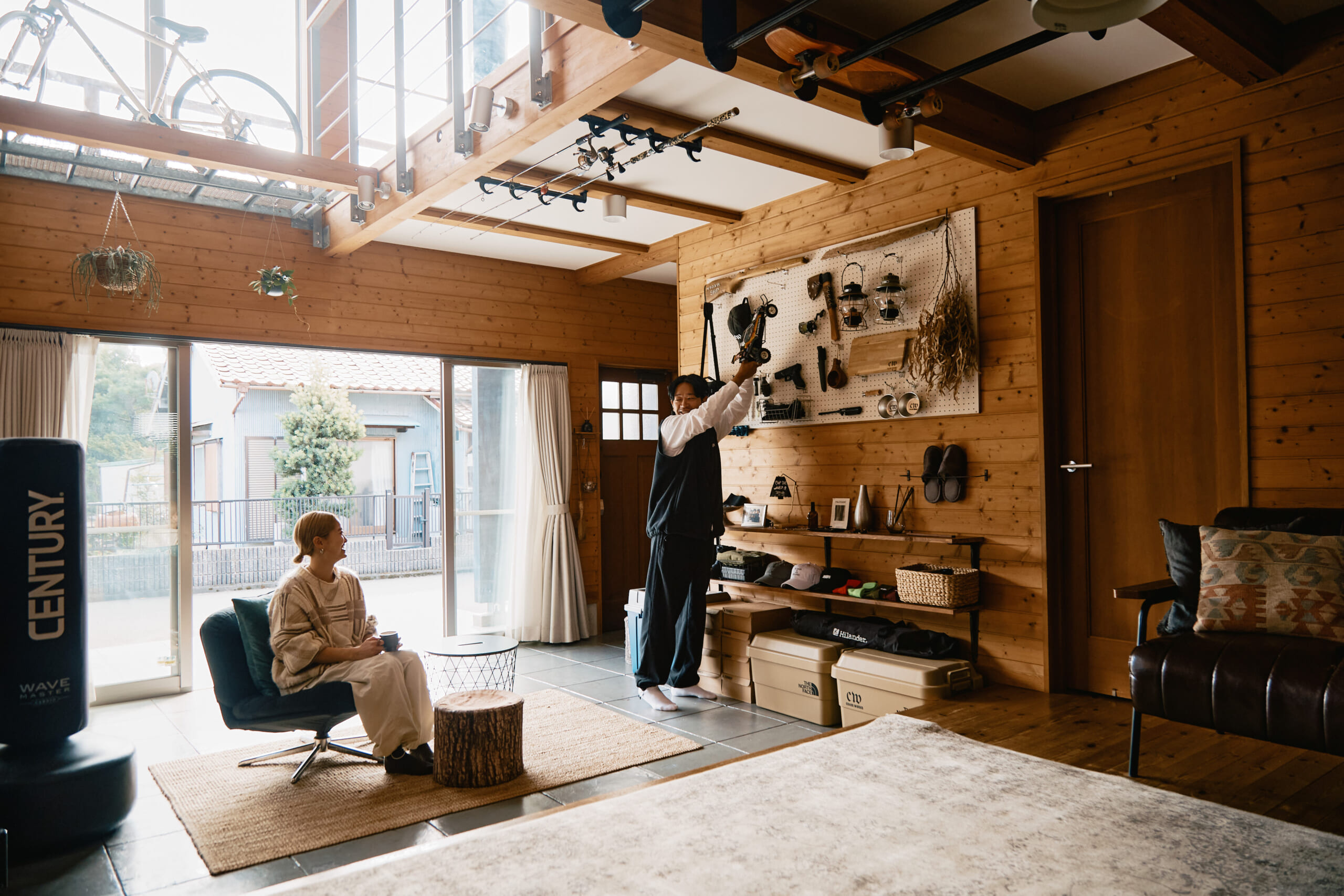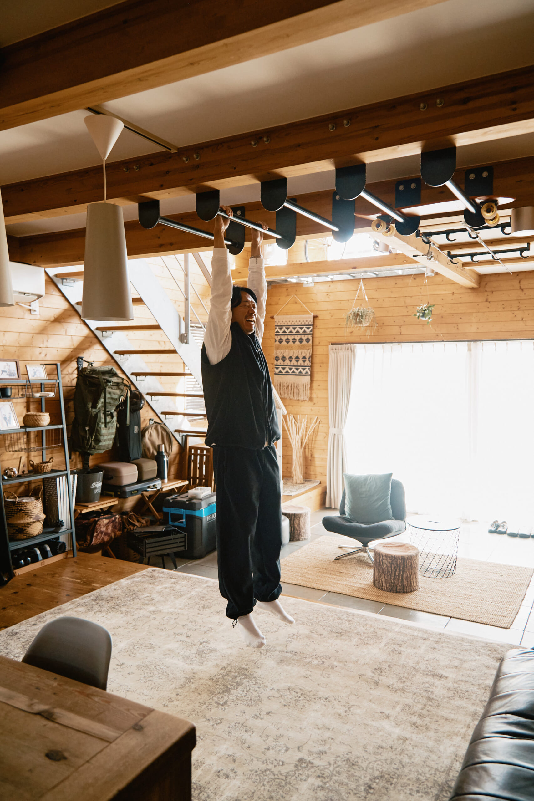 そして、真也さんが好きな色である黒の“ブラック”アイテムが空間を引き締めています。オプションで設置したウンテイは、懸垂などの運動にしっかり活用中! 体を動かそうと購入したサンドバックも、もちろんブラック。「この家は学校が近所。土間もあってサンドバッグやウンテイもあり、必然的に子どもが集まる場所になっていました(笑)」。